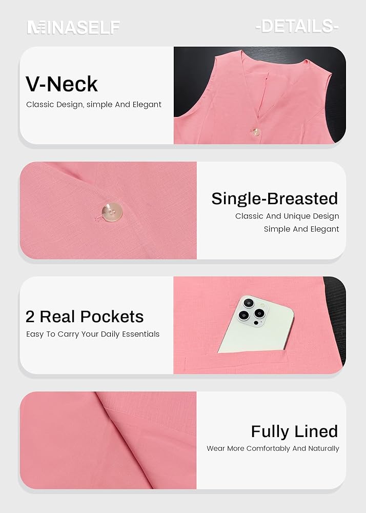 Features: Linen Vest Women,Fully Lined Linen Tops Blazers,Long Vest For Women Sleeveless,Simple And Classic Design,Single Breasted,Button Up,Solid Color,Business Casual And Loose,Lightweight,V-Neck,Simple Light Petite Blazer,Two Real Pockets.