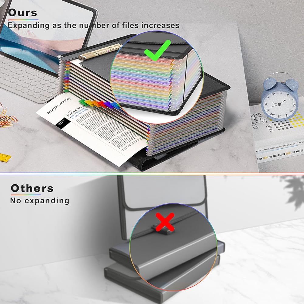 【تطبيق متعدد الوظائف】: منظم الملفات الموسع مثالي لتخزين العديد من الأدوات المكتبية واللوازم المكتبية والأوراق المدرسية والمهام الصفية والواجبات المنزلية والفواتير والبيانات والإيصالات والقسائم والفواتير والأدوات المنزلية. مثالية للمدرسة أو المكتب أو المنزل.