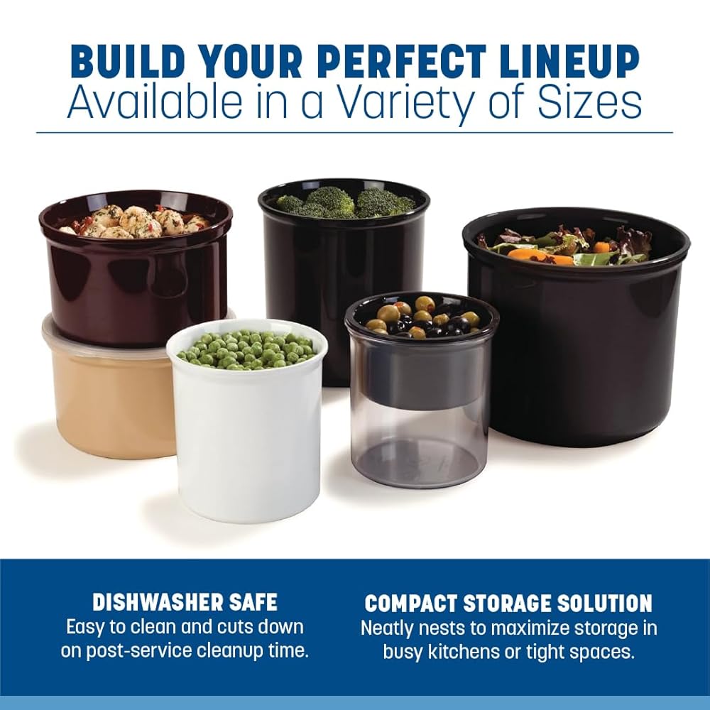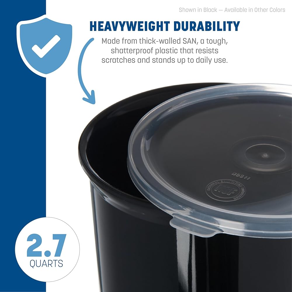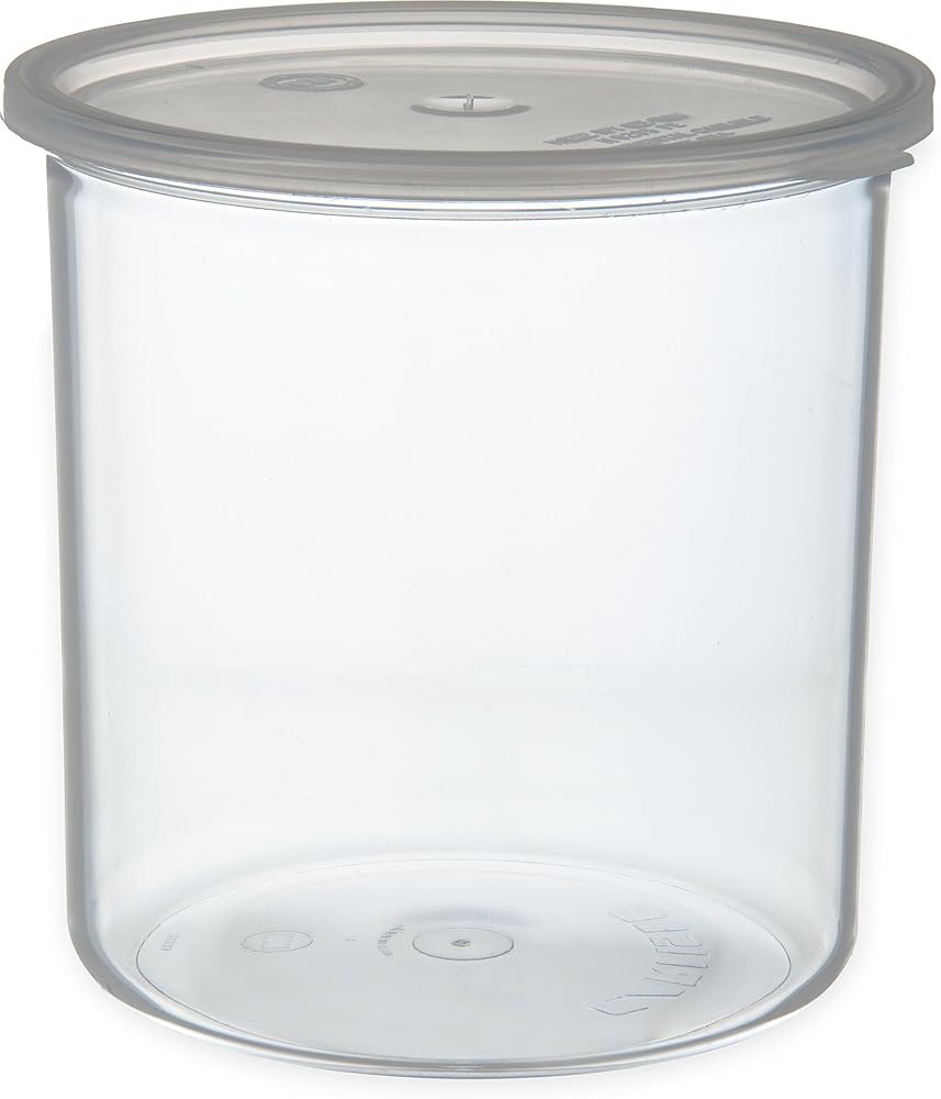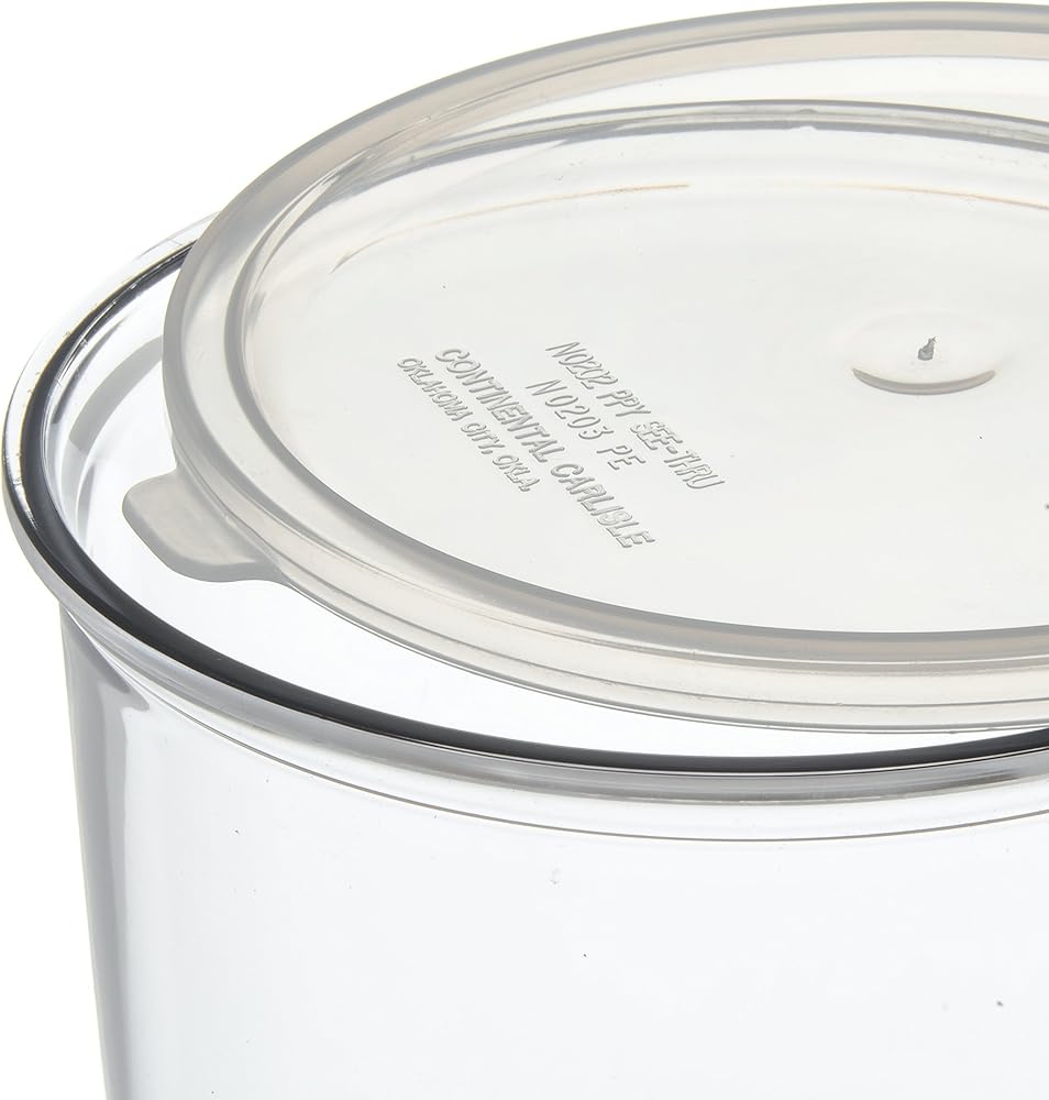 Elevate your food storage game with the Carlisle FoodService Products Classic Round Storage Container Crock. This 2.7-quart container in Clear offers a perfect blend of style and durability for your kitchen or foodservice establishment. Convenience meets freshness with the included translucent snap-on lids. They not only allow you to keep a watchful eye on your culinary creations but also securely seal in the freshness, ensuring your dishes remain at their best. Crafted with a thick-walled heavyweight design, these containers are made of rugged SAN (Styrene Acrylonitrile), known for its exceptional durability and longevity. Your food storage needs are in good hands. These containers exhibit excellent durability against food acids and dressings, guaranteeing the preservation of your ingredients' freshness, flavors, and quality. The high-gloss finish adds a touch of sophistication to your food storage setup while resisting scuffs and marks. Your containers will continue to look pristine and professional, no matter how busy your kitchen gets. Versatility is key, and these containers deliver with a temperature range of 0° to 180°F. Whether it's hot or cold food storage, these crocks have got you covered, offering flexibility in your kitchen operations.