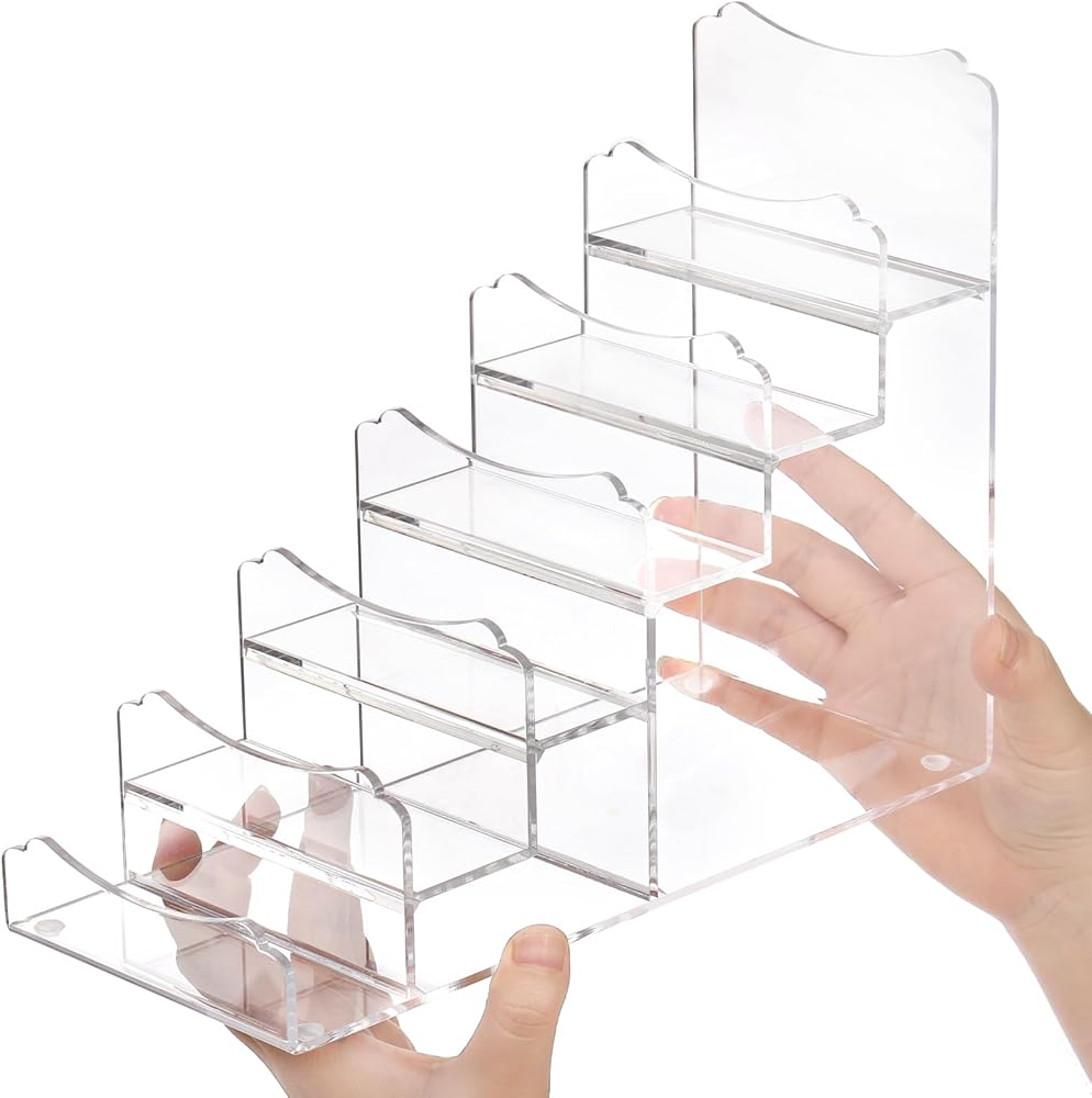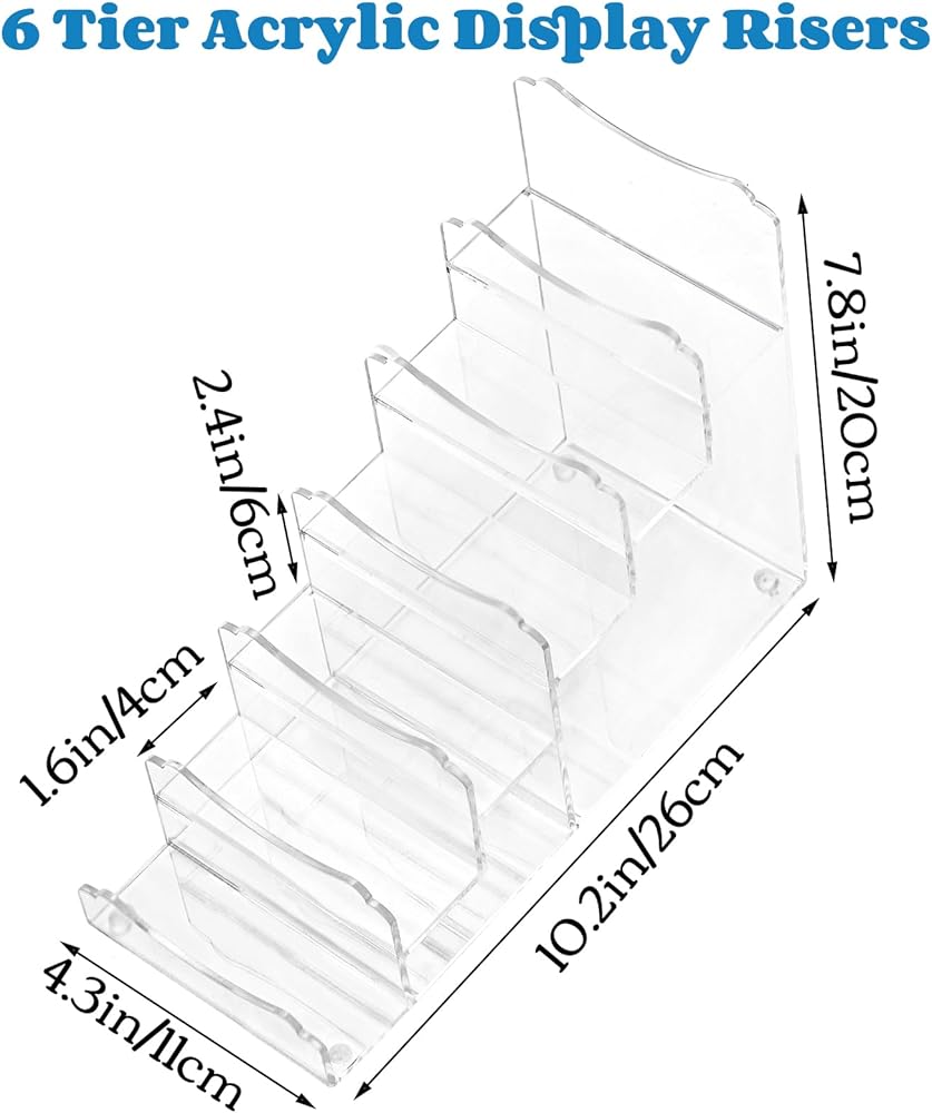 أرفف عرض أكريليك: يبلغ مقاس رف العرض الأكريليك المكون من 6 طبقات من YOUEON 10.2 بوصة طول × 4.3 بوصة عرض × 7.8 بوصة ارتفاع، وعرض كل طبقة 1.57 بوصة، ولا يشغل المنظم الدقيق والمدمج مساحة كبيرة وسيحافظ على مقتنياتك منظمة تنظيما جيدا