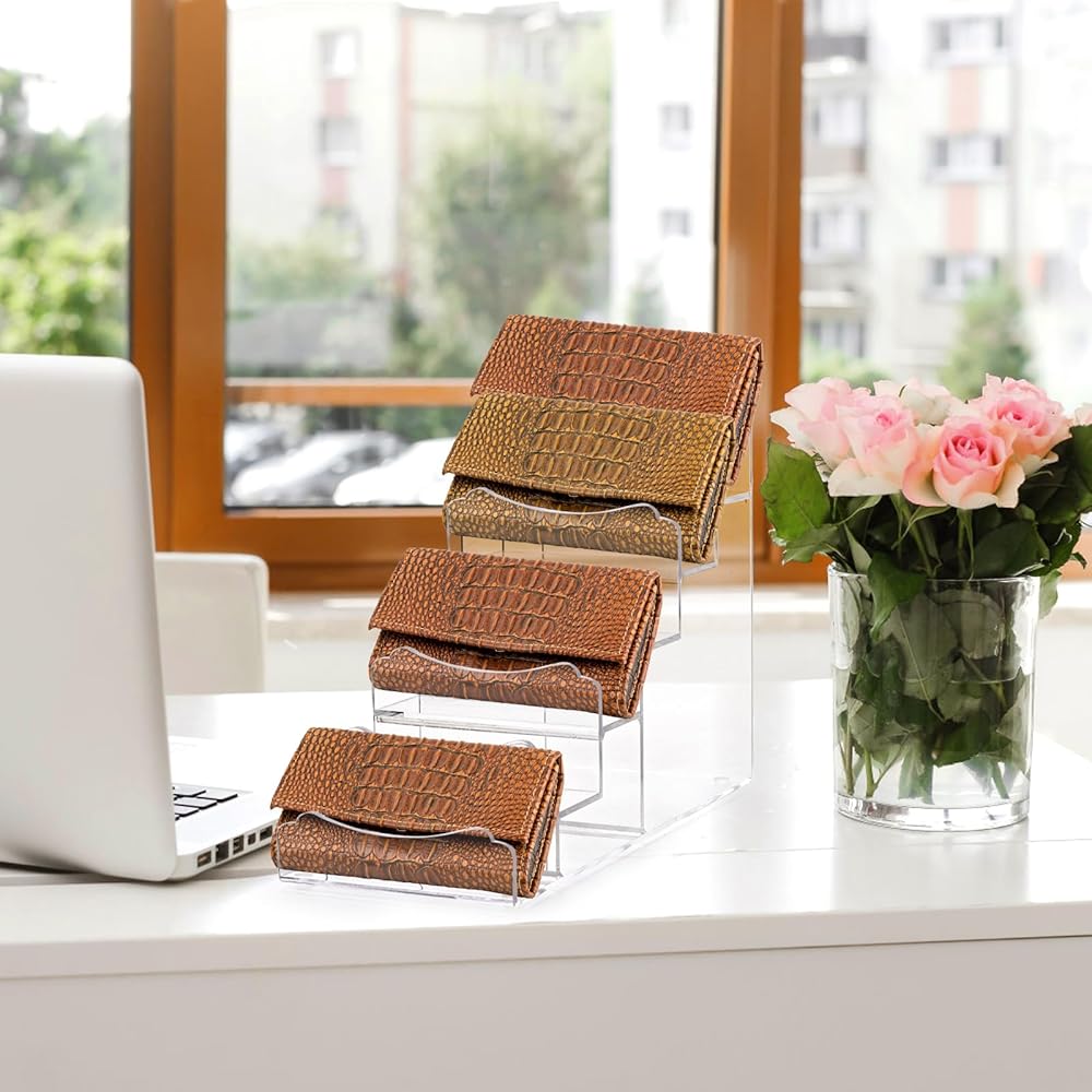 قوي ومتين: حامل عرض المحفظة متعدد الطبقات مصنوع من مادة أكريليك عالية الجودة، متين وغير قابل للكسر، مع قدرة تحمل قوية للوزن. توفر القاعدة المتينة والإطار المثلث ودعم الوسادات المضادة للانزلاق أقصى قدر من الثبات