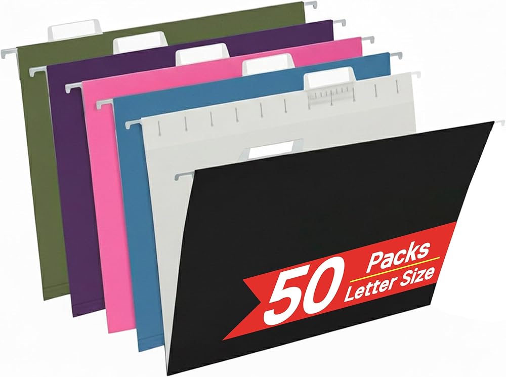 مجموعة مجلدات التعليق: 25 مجلد ملفات تعليق بحجم حرف بألوان متنوعة (وردي، برتقالي، أزرق، أصفر، أخضر) تناسب ورق بحجم الحروف القياسي 8.5 بوصة × 11 بوصة، تحافظ على أوراقك في وضع مستقيم بشكل أنيق في أدراج المكتب وخزائن الملفات.