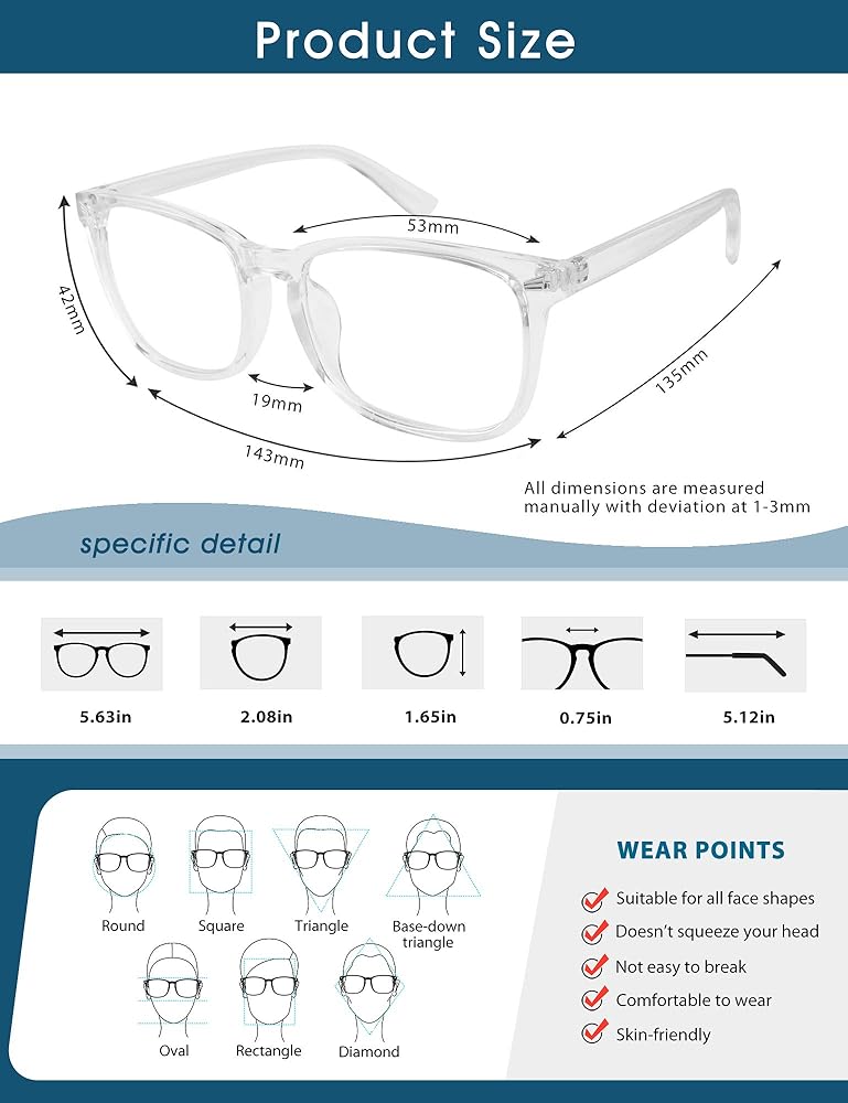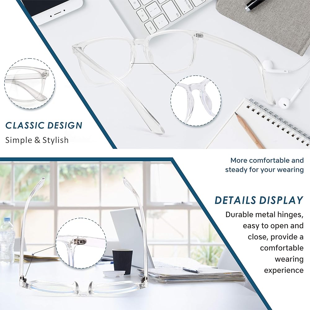 • 👓【ارتداء مريح】 خفيف الوزن ومتين. هذه النظارات الأنيقة المقاومة للضوء الأزرق تناسب جيدًا ومناسبة لجميع أنواع أشكال الوجه. يمكنك ارتداء نظارتنا لفترات طويلة أمام الشاشات الرقمية أو رحلتك القادمة خارج المدينة.