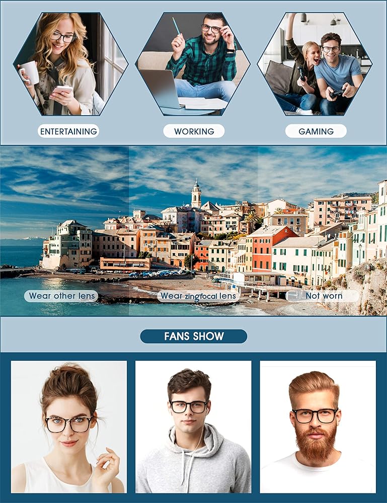• 👓 【تقليل إجهاد العين والمتلازمة البصرية】يمكن لنظارات Zingfocal الزرقاء المقاومة للضوء أن تخفف من التعب البصري وعدم الراحة الناتج عن فترات طويلة من تصفح الويب والألعاب والعمل تحت أضواء الفلورسنت مع الحماية وتقليل الوهج.