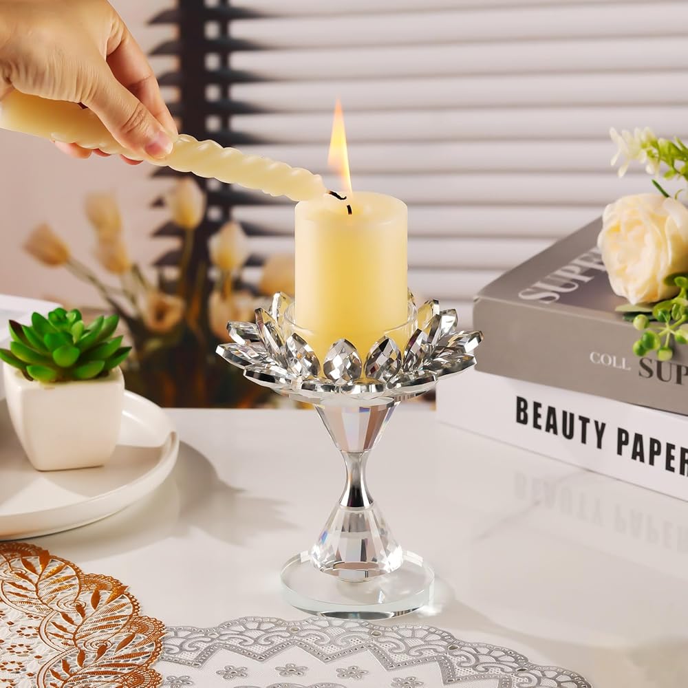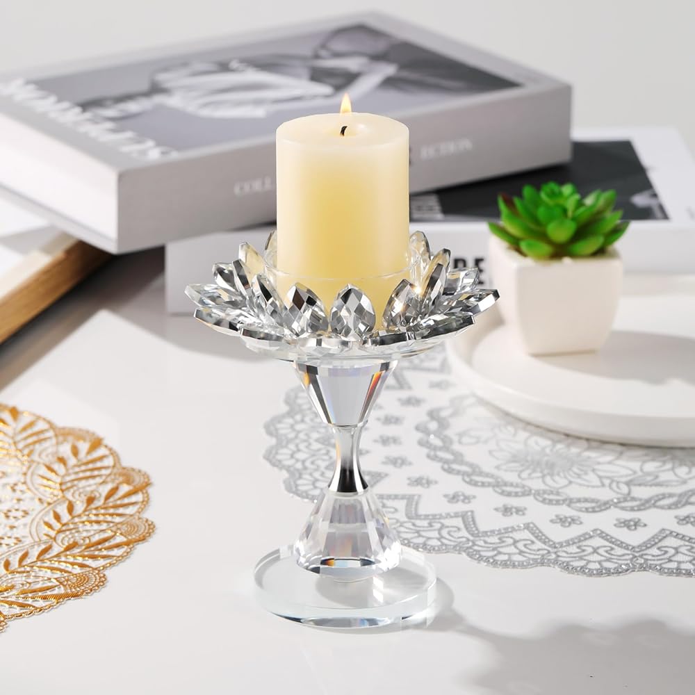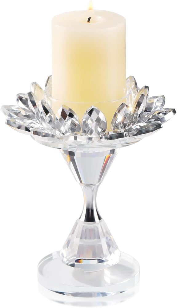 مادة كريستال K9: مصنوع من كريستال K9 الفاخر، يشع حامل الشموع الزجاجي هذا بريقًا ووضوحًا رائعًا، مما يزيد من الجاذبية البصرية لشموعك العمودية. تبلغ أبعاده الإجمالية 4.5 × 4.5 × 5.3 بوصة ويزن حوالي 0.85 رطل. حامل الشموع هذا مناسب للشموع التي يقل قطرها عن 2.16 بوصة
