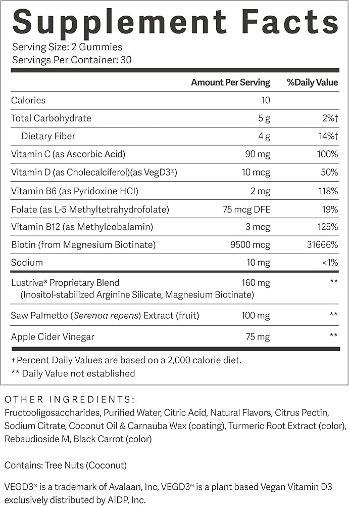 PREMIUM INGREDIENTS: Each gummy is packed with our hair-supporting formula designed to help you tackle any nutrient deficiencies that may be preventing you from getting the smooth, strong, youthful looking hair you want and deserve. Notable active ingredients include Lustriva, Vitamins D, C, and B12, as well as Saw Palmetto, Folate, and Biotin.*