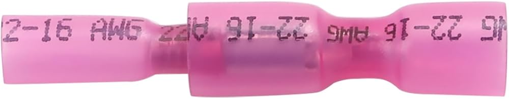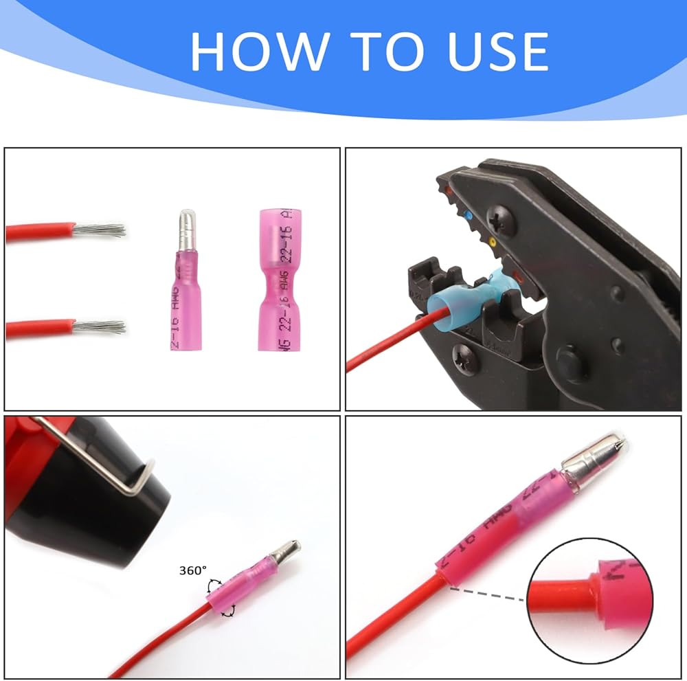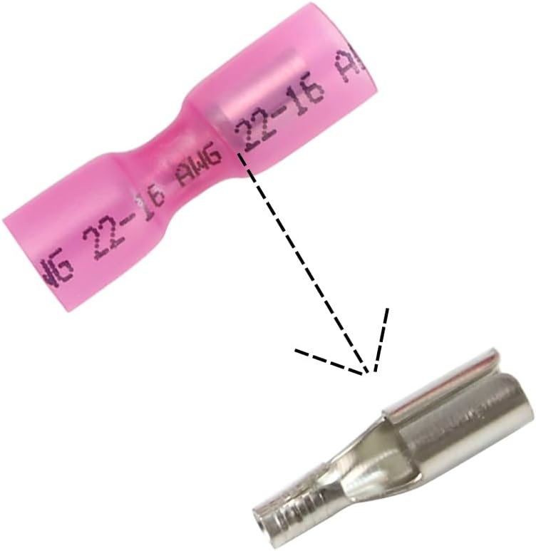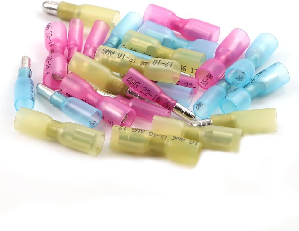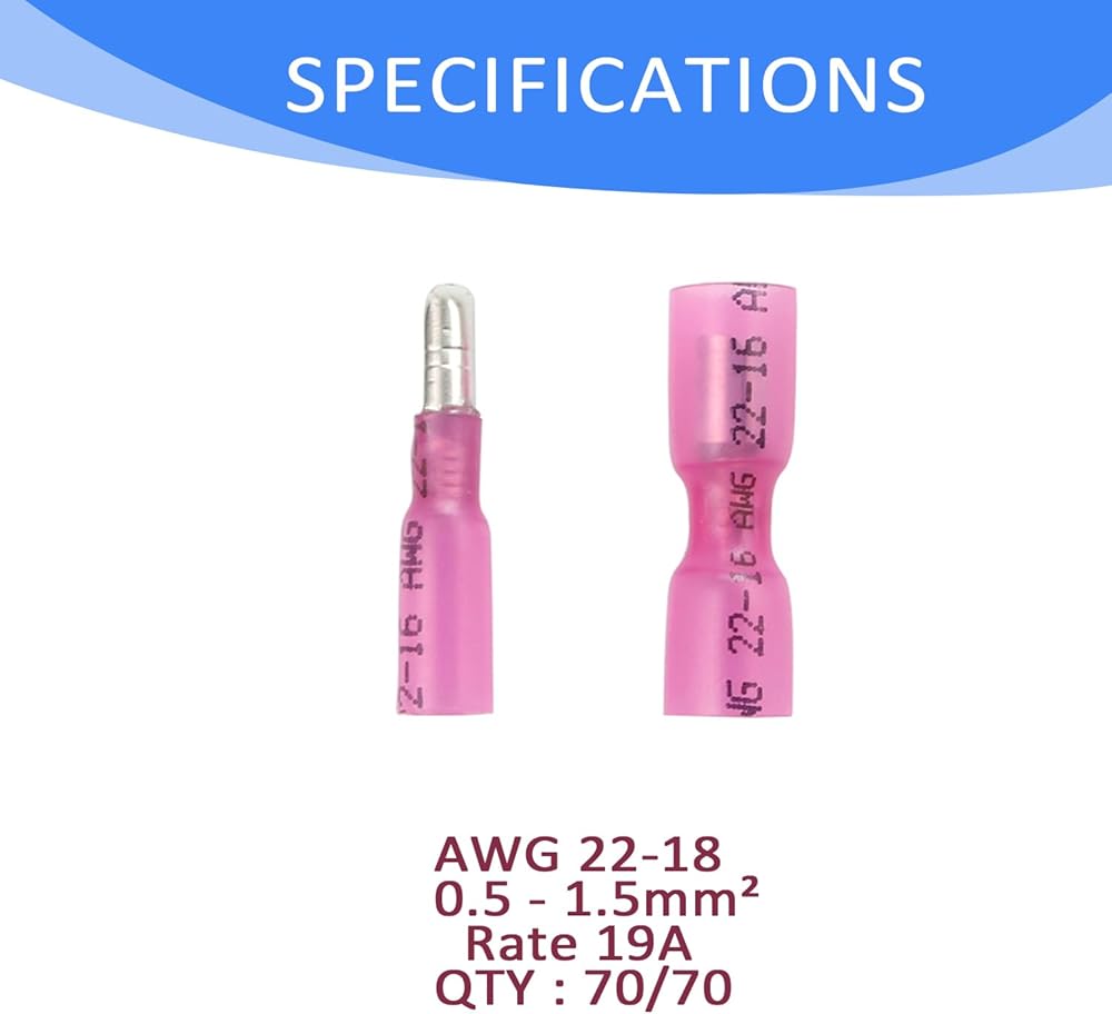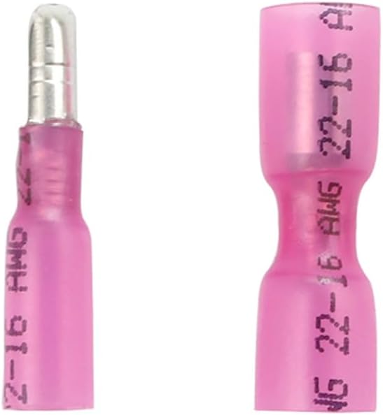 Heat Shrink Bullet terminals protects splices from water and corrosion.Providing strain relief and against vibration in rugged environments,which excellently insulates and protects electronic connections. Copper barrel provides increased current flow, and ensures less voltage drop, preventing wiring failures and reducing equipment downtime. Thick copper barrel ensures a strong wiring connection every time. Your wire will never slip out of these heat shrink connectors. Package includes: Total 100pcs50set Heat Shrink Male/Female Bullet Connectors.Wire range: 22-18 ( red )A.W.G., Wire range: 0.5-1.5mm²,Max current=19A Strip wire insulation, crimp terminal barrel with a wire crimper, and apply heat with a heat gun while rotating a connector. Heat shrink tubing will reduce in size and adhere to the wire. No soldering kit needed. Start making secure and durable connections in seconds.