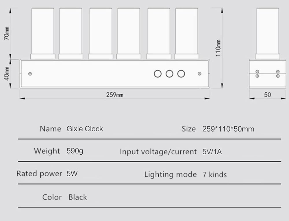 ★ Specification Product weight: 1.3 lb Product size: 10.2 * 4.3 * 1.9 in Product material: steel, walnut, glass, acrylic, etc. Input voltage / current: 5V / 1~2A Rated power: 5W Display mode: 7 kinds -Normal display mode, each tube displays the same color. Press and hold the button '1' or '2' to adjust the color of all lamps. -Each tube has the same color and is white (silver). -The color of each tube will change gradually in "Red→Orange→Yellow→Green→Cyan→Blue→Purple", which is very beautiful. -Each tube is not the same color, and the color of each tube will change, and the clock will become as beautiful as a rainbow. -The color of the tube is the same, but the number of all the tubes will slowly pulsate from 0 to 9, and the color will gradually change. -The display mode is the same as mode 5, but beating speed of the lamp number will increase a lot. -Only two lamps will illuminate symmetrically. The number of the lamps that are lit will quickly pulsate, and the color of the lamp will change once every cycle. Tip: Modes 5, 6, and 7 do not have a clock function. In the power-on state,insert the small switch to the seconds tube for 2s to change 12/24 hour display mode. ★ Package List 1 × Digital clock 1 × USB charging cable