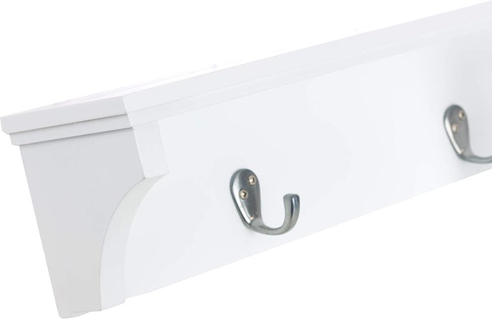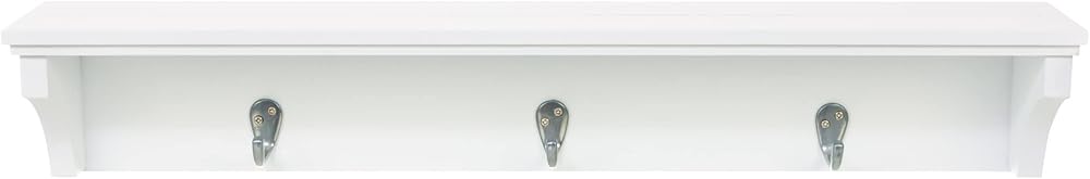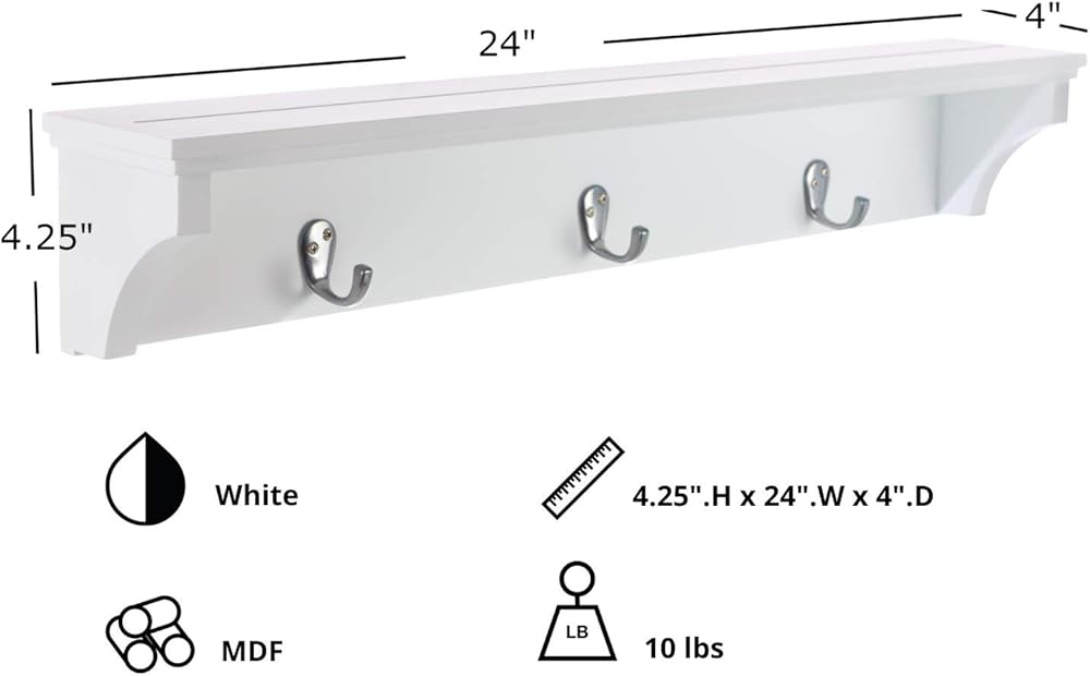 Elevate your interior decor with the Kiera Grace Finley Floating Shelves - a perfect blend of modern design and functional versatility. Measuring a generous 24 inches, these shelves offer a spacious platform to display your favorite items, adding a touch of sophistication to your home or office. Crafted from premium-quality materials, these shelves ensure durability and longevity. The sleek white finish adds a contemporary flair, making them a stylish addition to any space. The modern design not only enhances the aesthetic appeal but also complements various decor styles. What sets these shelves apart is their versatility. Perfect for showcasing decor, books, or essentials, these floating shelves seamlessly blend into any room. The inclusion of three metal hooks adds an extra layer of functionality, allowing you to conveniently hang keys, hats, or small accessories. Transform your wall into a personalized gallery and express your creativity by arranging and displaying cherished photos, art, or collectibles. These shelves are a practical and stylish solution for decluttering and organizing your space. Upgrade your home or office with the Kiera Grace Finley Floating Shelves - a combination of modern design, durability, and versatility.