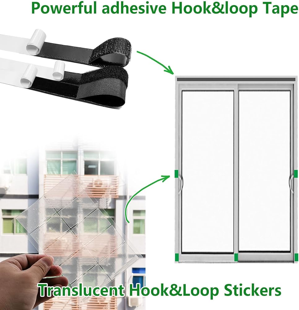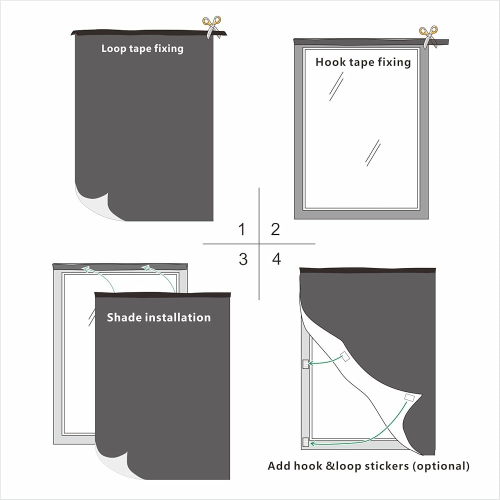Fast and easy installation / Free cutting, applicable to windows of different specifications and shapes. Use Hook&Loop tape to fix the top and Hook&Loop stickers to fix the corners.
