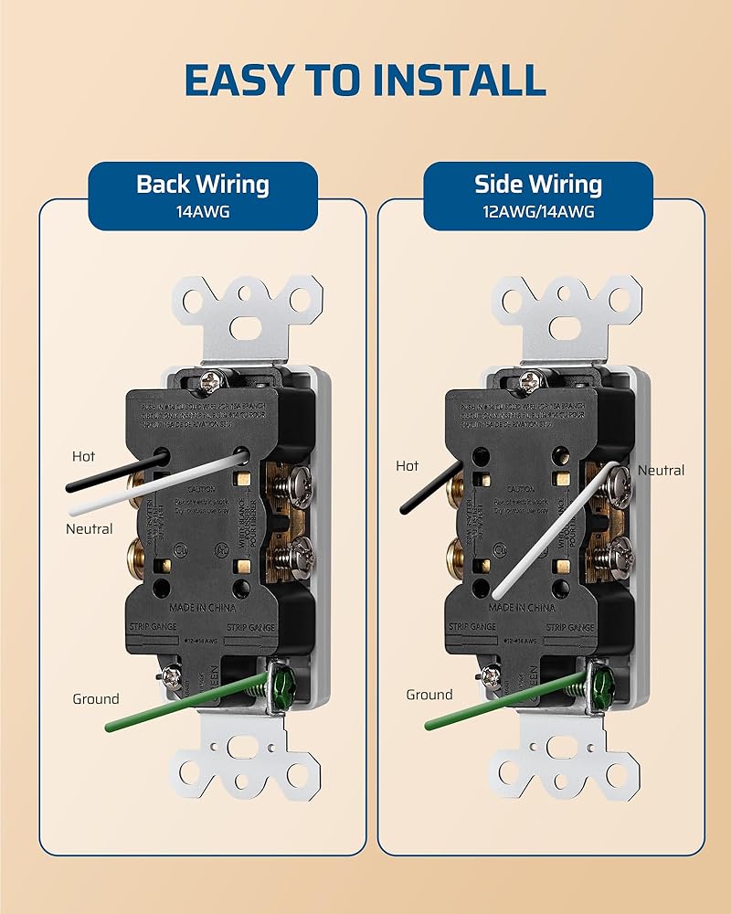 【سهلة التركيب】تتوفر الأسلاك الجانبية أو الخلفية، مما يجعل منفذ الوعاء آمنًا وسهل التركيب، وفتحة خلفية لسلك قياس 14، وجانب لسلك قياس 12 و14. الحجم القياسي لمعظم صناديق المنافذ
