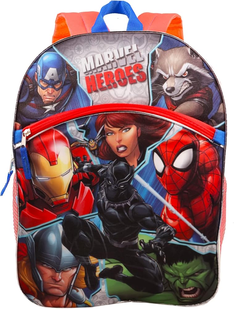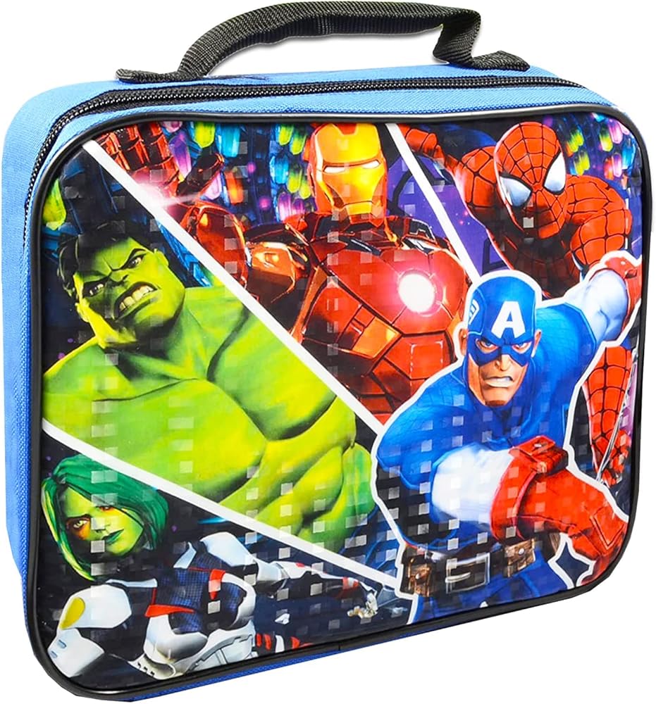 Avengers Backpack with Lunch Box Set - Bundle with 15" Avengers Backpack, Marvel Lunch Bag, Stickers, Bracelets, More | Avengers Backpack for Boys. This Avengers backpack set includes a 15” backpack with adjustable shoulder straps, zip closure compartment, and top loop for hanging featuring colorful artwork of favorite Avengers including Iron Man, Captain America, Spiderman, and more. This Avengers backpack for kids set also includes an insulated lunch box featuring colorful artwork of even more of your favorite superheroes, ideal for keeping your food at the perfect temperature all day. Show off your love of the Avengers in style. This Marvel backpack bundle also includes a Marvel fun pack with stickers and activity pages, Marvel emoticon stretch bracelets, and a superhero door hanger, making the perfect gift set for any Avengers fan. Officially licensed Avengers backpack and lunch box set is perfect for kids of all ages, boys and girls alike.