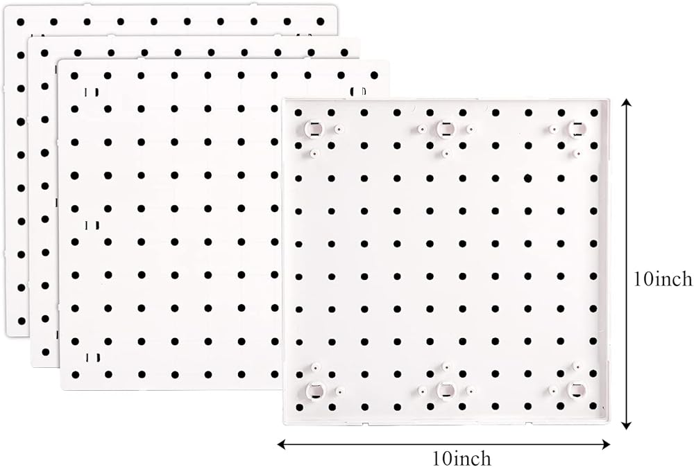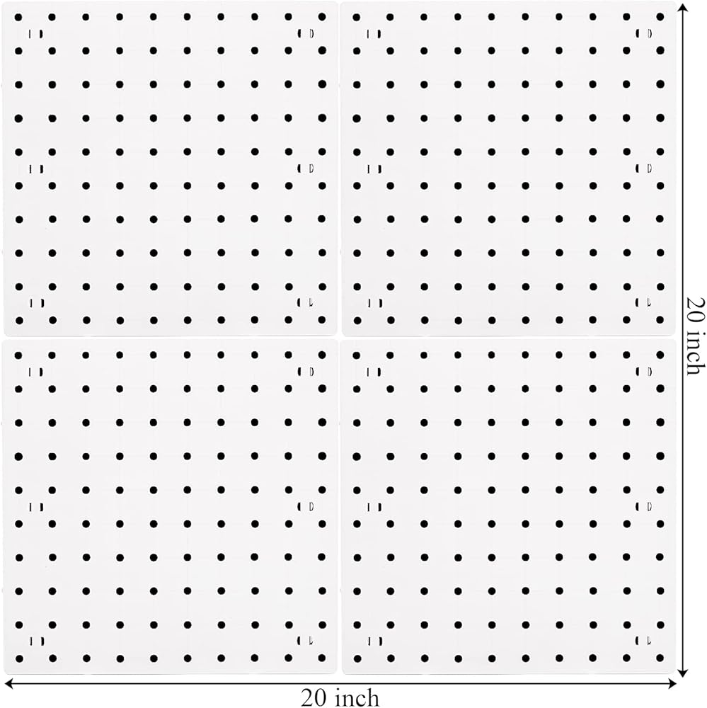 This pegboard organizer panel kit is made of high-quality ABS plastic, which is durable and has a strong bearing capacity. Each peg board measures approx. 10 x 10 inches and the hole diameter is 1/4 inch. 4 pieces pegboard panel can be spliced together to become 20 x 20 inches. If you want a larger one, you can try several more pieces to splice together.
