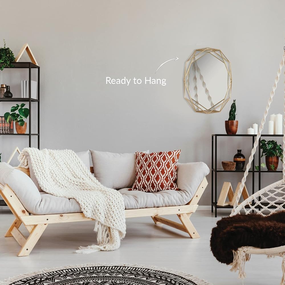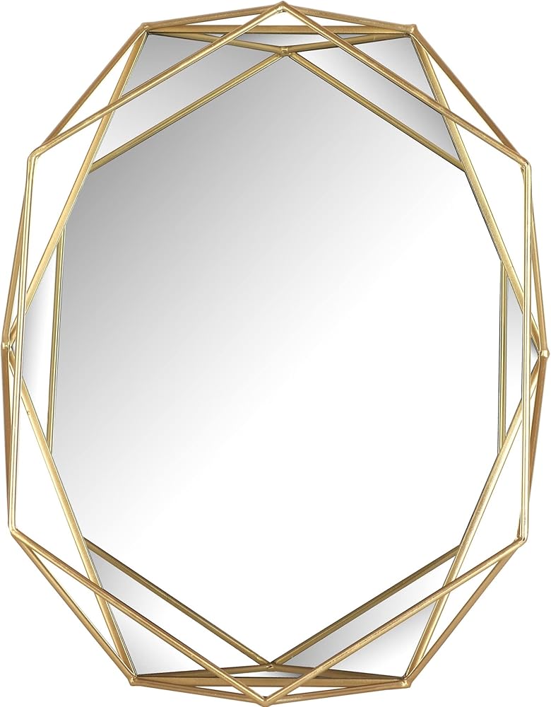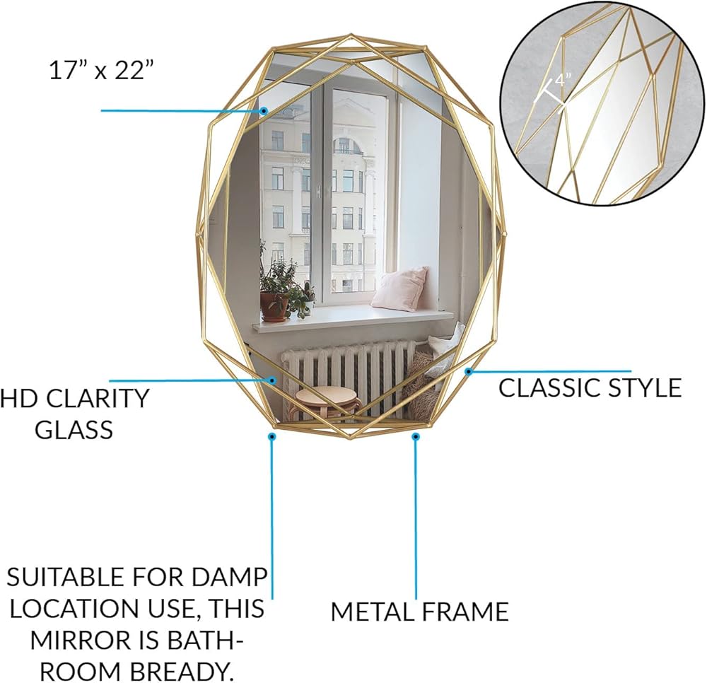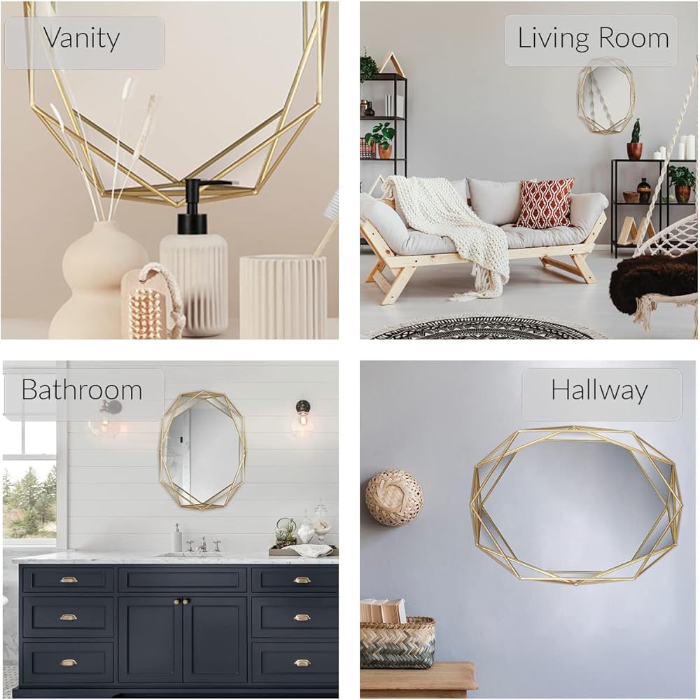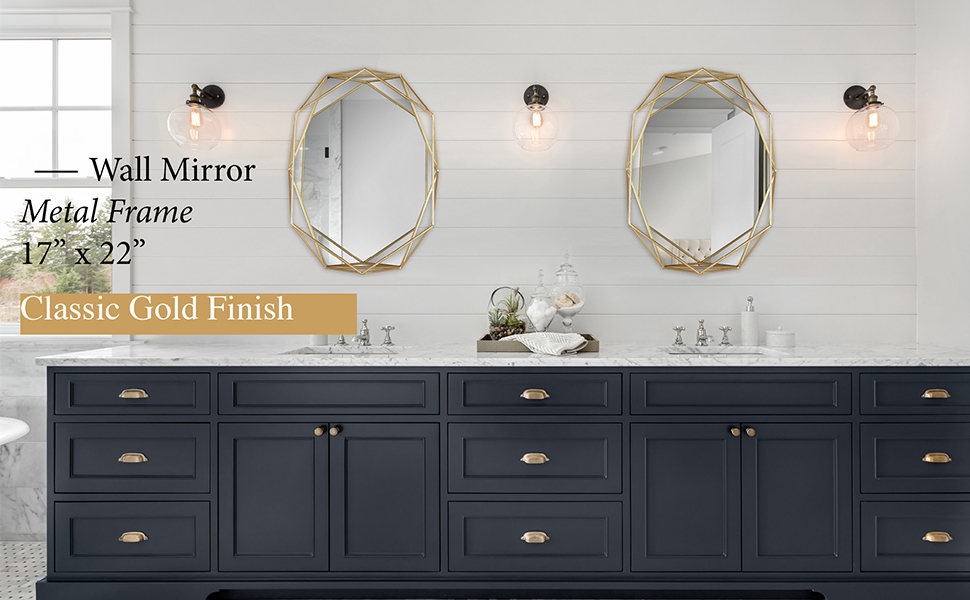 ✔PERFECT SIZE AND DESIGN: This 17''x 22'' hexagon wall mirror with 4'' depth frame is the ideal size for the home interiors. The classic gold finish of this elegant geometric mirror accents any room perfectly and it highlights a modern style to any interior spaces; such as living room, bathroom, hallways, entryways or bedrooms. It is definitely a must have home décor due to its capability to add a chic sense to your space and it makes any wall space look incredible.