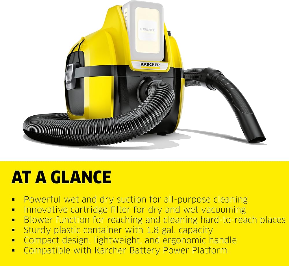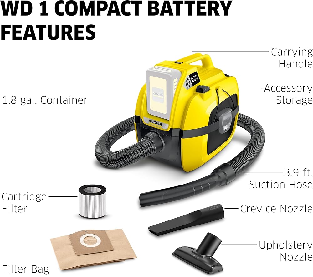 What's included: The Kärcher WD 2-18, a floor nozzle, a crevice nozzle, a cartridge filter, a fleece filter bag, and a 6 ft. suction hose. The compatible Kärcher 18V battery and charger are sold separately.