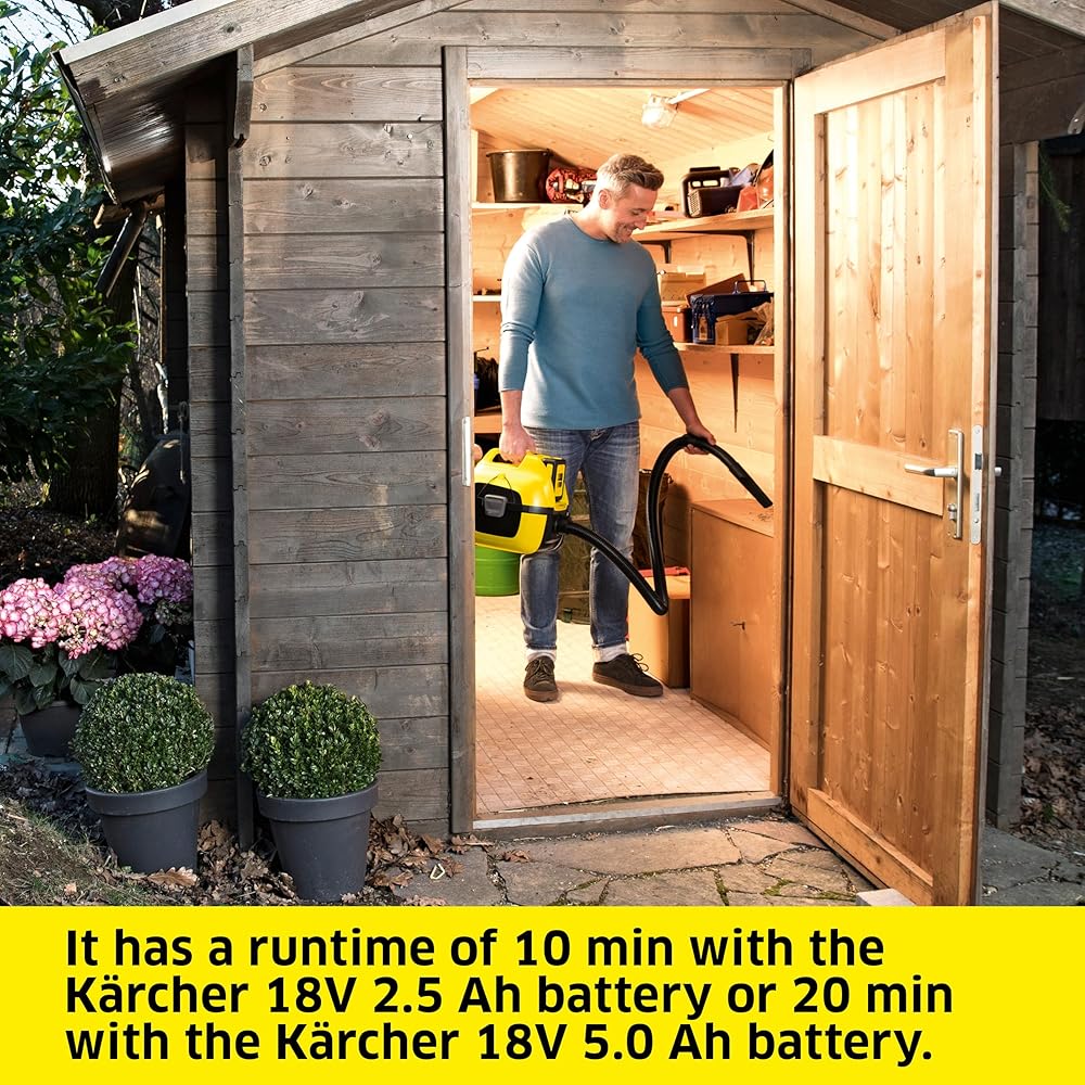 The Kärcher Battery Wet And Dry Vacuum Cleaner WD 2-18 not only offers powerful suction, but also maximum flexibility when in use. The all-purpose vacuum cleaner is battery-powered and ready to go wherever it is needed, as no power outlet is required. It works together with the separately available 18 V battery from the Kärcher Battery Power battery platform and, depending on the battery size, has a run time of 10 (18 V/2.5 Ah battery) or up to 20 min (18 V/5 Ah battery). This makes the wet and dry vacuum cleaner ideal for quick cleaning jobs in between. The WD 2-18 easily vacuums wet and dry dirt from all types of floors - without having to change the filter in between, thanks to a one-piece cartridge filter. The vacuumed dirt is collected in the 3.2 gal. container made of sturdy plastic. The battery-powered wet and dry vacuum also offers a blowing function. This is particularly handy when removing leaves, loose dirt or small bits of debris from surfaces that cannot be vacuumed, such as gravel. Thanks to the sturdy castors and the practical carrying handle, the multifunctional vacuum can be easily transported from one place to another. There are many possible areas of use: not only for cleaning interior floors, but also for use in the garden. Whether it is utilised for cleaning patios, basements, sheds or workshops – the battery-powered wet and dry vacuum cleaner is a true all-rounder. In addition, it is ideal for cleaning car interiors. The scope of delivery includes the Kärcher Battery Wet And Dry Vacuum Cleaner WD 2-18, a one-piece cartridge filter, fleece filter bags, a crevice nozzle and a clip-on floor nozzle (wet & dry suction nozzle), 2 suction tubes and a 6 ft. suction hose. The 18 V Kärcher battery platform is sold separately.