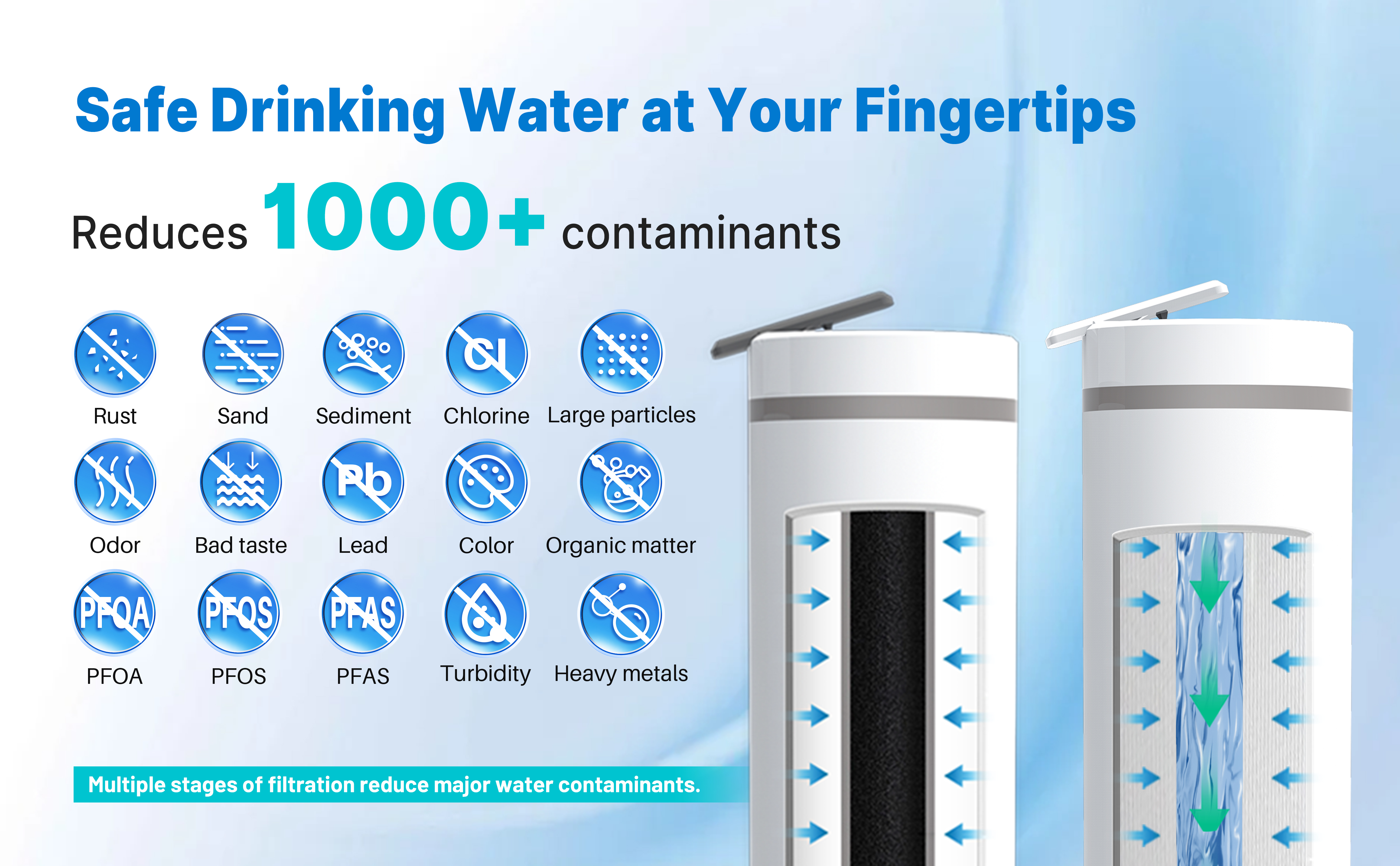 • 𝗦𝘂𝗽𝗲𝗿𝗶𝗼𝗿 𝟬.𝟬𝟬𝟬𝟭 𝗠𝗶𝗰𝗿𝗼𝗻 𝗘𝗳𝗳𝗶𝗰𝗶𝗲𝗻𝘁 𝗙 𝗶𝗹𝘁𝗿𝗮𝘁𝗶𝗼𝗻 - يعمل فلتر PPC 2 في 1 على تقليل الجزيئات الكبيرة بنسبة 100%، و99.99% من الكلور المتبقي واللون والرائحة. يتميز فلتر RO بحجم مسام دقيق يبلغ 0.0001 ميكرون، والذي يمكنه إزالة أكثر من 99.99% من المعادن الثقيلة بما في ذلك الرصاص والزئبق وPFAS والكادميوم وأكثر من 1000 نوع من الملوثات. سوف يخطرك ضوء LED المدمج بقيمة TDS في الوقت الفعلي ويذكرك باستبدال المرشحات عند الضرورة.