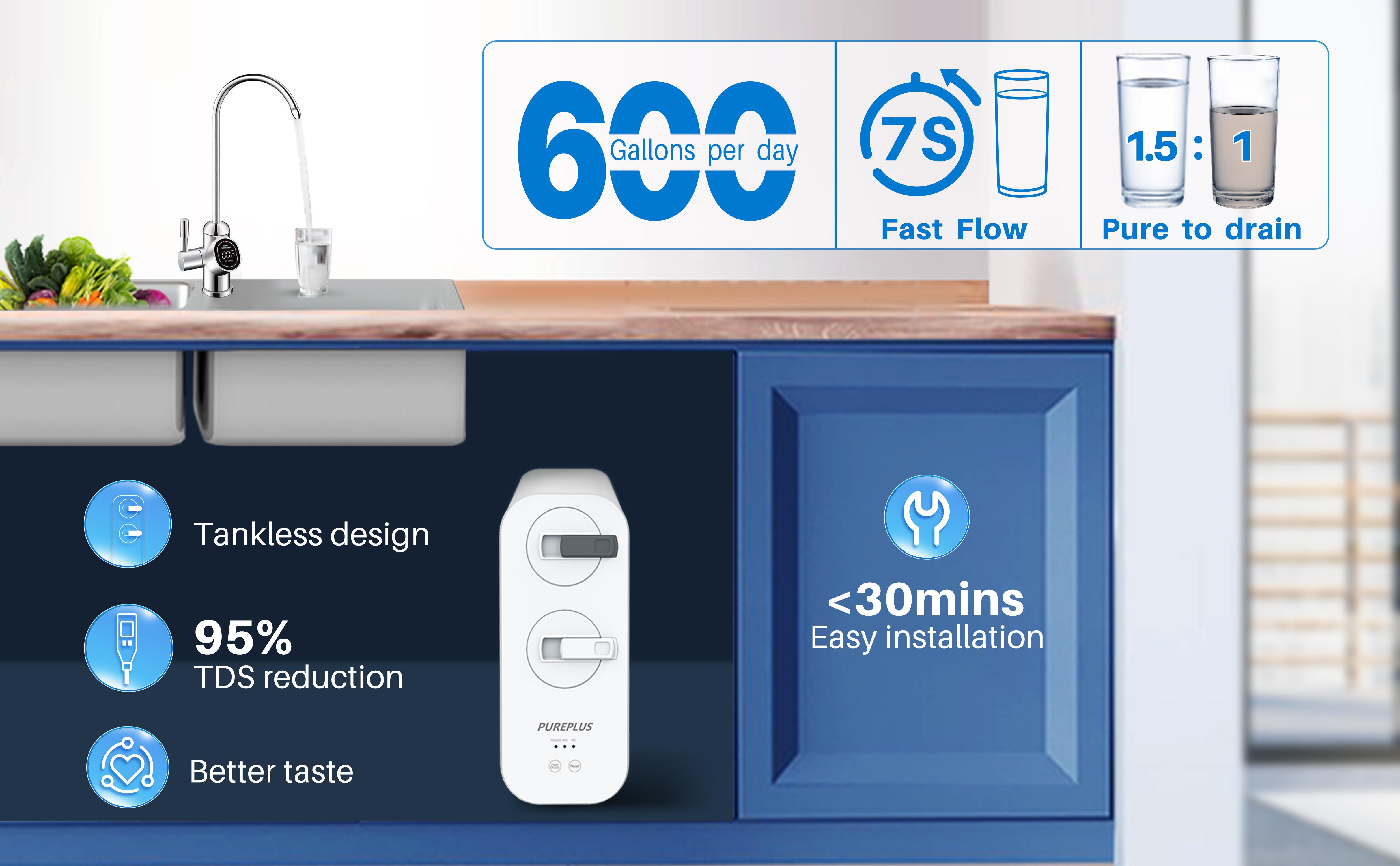 • 𝟔𝟎𝟎 𝐆𝐏𝐃 𝗛𝗶𝗴𝗵 𝗙𝐥𝐨𝐰 & 𝟏. سرعات أسرع، ومياه أقل من النفايات. وهذا بالتأكيد أسهل من سحب جالونات من الماء أسبوعيًا من المتجر وستكون الجودة قابلة للمقارنة. نظام تصفية المياه PUREPLUS RO يستحق بكل صدق كل قرش.