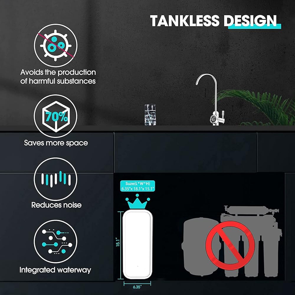 • 𝐓𝐚𝐧𝐤𝐥𝐞𝐬𝐬 𝐃𝐞𝐬𝐢𝐠𝐧 & 𝗔𝐮𝐭𝐨 𝐂𝐥𝐞𝐚𝐧𝐢𝐧𝐠 - يتجنب التلوث الثانوي في خزان المياه، ويوفر 7 5% من المساحة، تناسب تمامًا أسفل الحوض، وتقلل من الضوضاء وتمنع تسرب المياه. إلى جانب وظيفة التنظيف التلقائي لنظام PUREPLUS RO، مما يوفر لك كل قطرة من المياه العذبة للغاية.