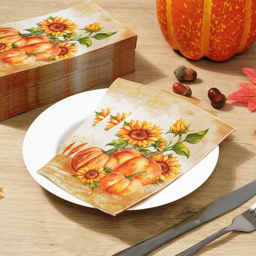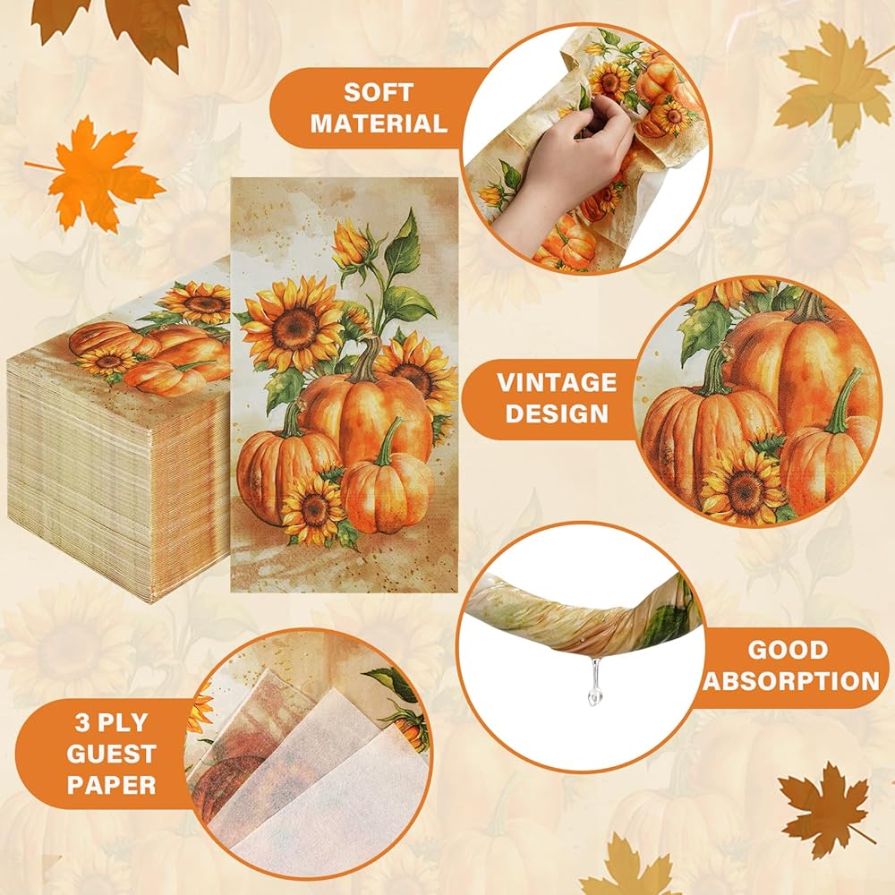 100 قطعة من مناديل عيد الشكر من Homlouue 3 طبقات للاستعمال مرة واحدة مناديل ورقية للخريف لحفلات عيد الشكر والخريف وحفلات اليقطين وعباد الشمس الورقية للضيوف للحمام والمطبخ وديكور المنزل بتصميم عتيق