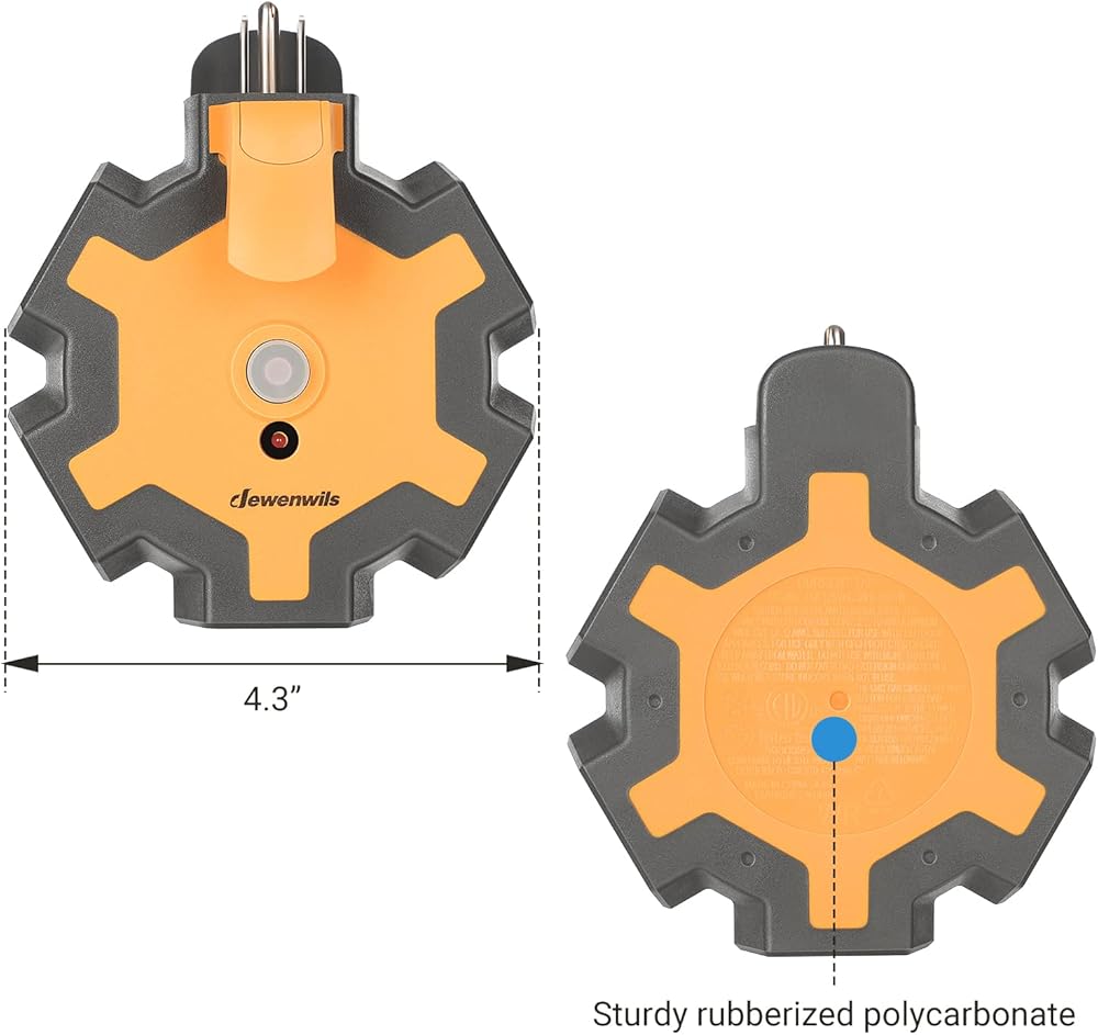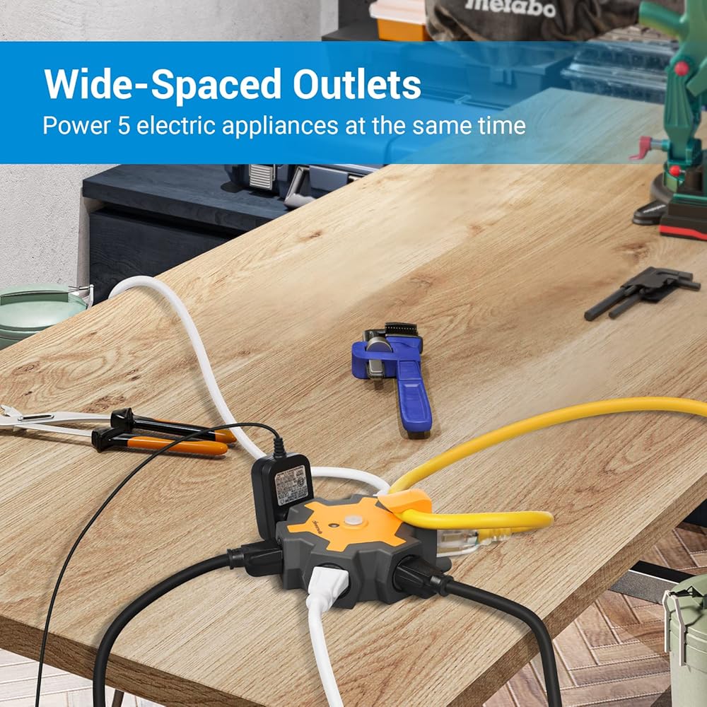 【6-Grounded Outlets】 The outlet extender fits with any indoor, outdoor extension cord well, great to expand one outlet to six in work places. 6 outlets (125V/15A/1875W) arranged in 2 sides with wide space, allows you use bulky adapter plugs in workshop