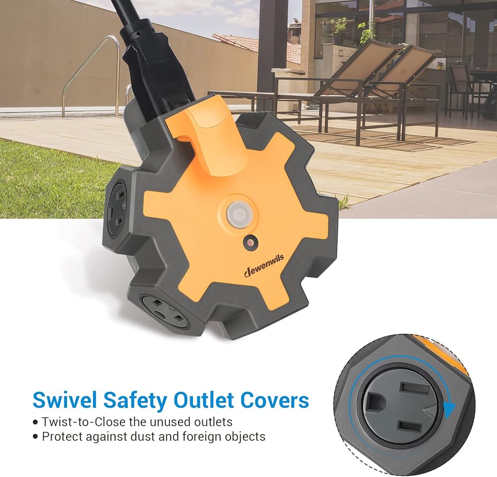DEWENWILS Outdoor Extension Cord Power Adapter, Heavy Duty 5-Outlet Power Hub with Swivel Safety Covers, Widely-Spaced Power Outlet for Workshop, Jobsite, Garage, 15A Circuit Breaker (Orange)