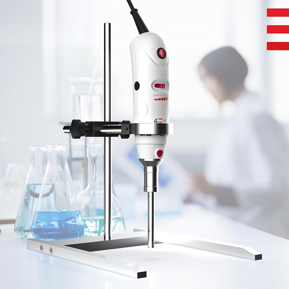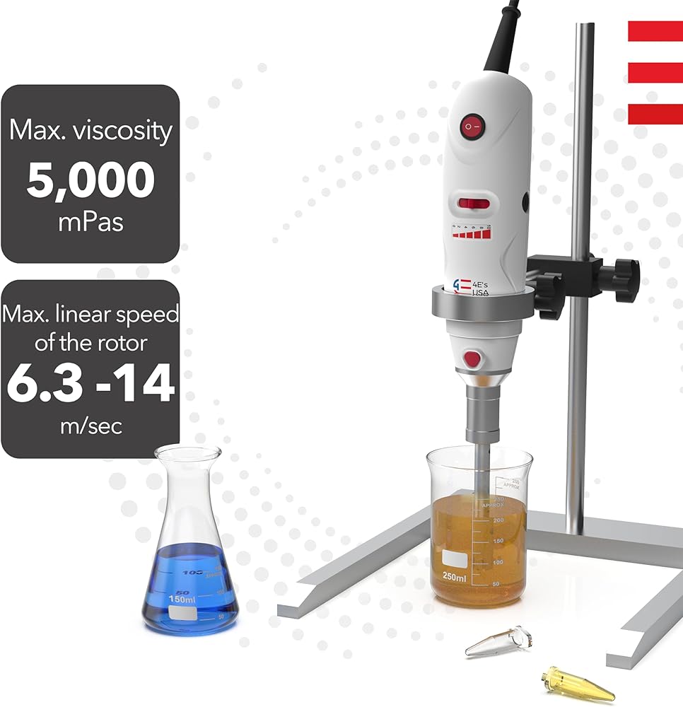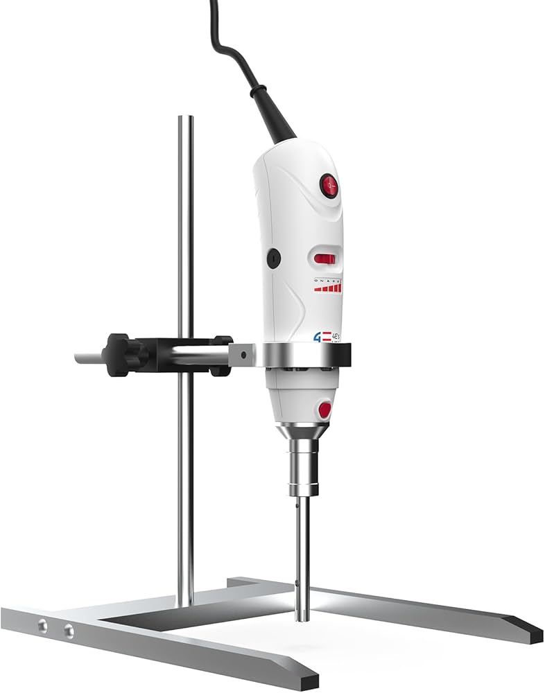 4E's USA جهاز تجانس محمول باليد مع حامل، مستوى 10 سرعات من 8000 إلى 30000 دورة في الدقيقة، مسبار 316L من الفولاذ المقاوم للصدأ 10 مم لعينة 1 مل إلى 250 مل، أقصى لزوجة 5000 مللي باسكال