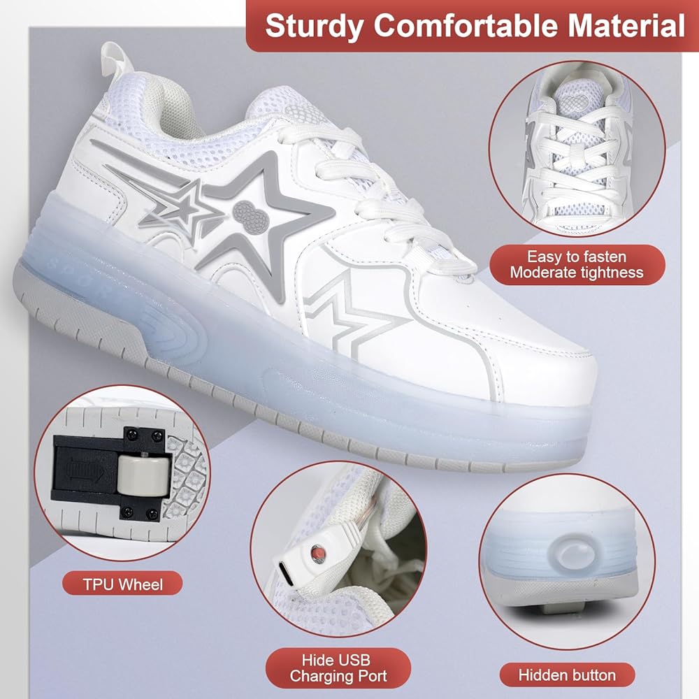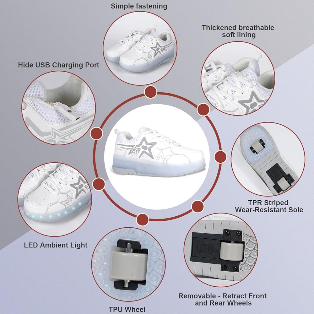 Excellent function: easy to use, the front wheel can be disassembled to make a unicycle shoe, you can also press the button on the heel to retract the rear wheel, which can turn it into a regular sports shoe. It can also be turned into an inline skate. We have both Velcro and lace-up styles.