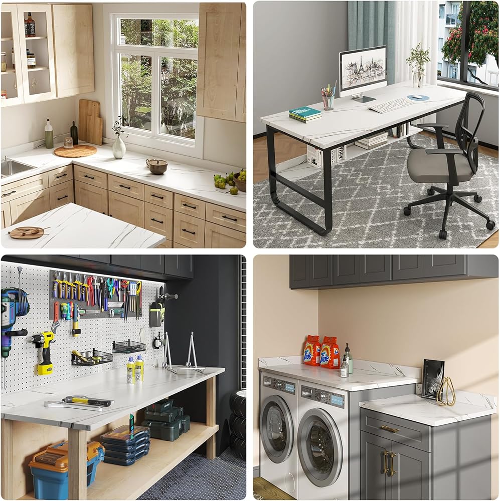 نطاق واسع من الاستخدامات - قم بإنشاء طاولة مطبخ أنيقة وقوية أو جراج أو غرفة فنية أو سطح مكتب. يمكن دمج سطح العمل المصفح هذا مع قواعد مختلفة وفقًا لتفضيلاتك، مثل الأرجل المعدنية، والأرجل الخشبية، والخزائن، وما إلى ذلك. ويمكن استخدامه أيضًا كطاولة كمبيوتر، وطاولة مطبخ، وطاولة قهوة، وطاولة محطة عمل على شكل حرف L، وحامل خشبي. طاولة، مكتب، طاولة مزدوجة، خزانة ملابس، طاولة ألعاب، إلخ. ولكن لا يُنصح باستخدامها على لوح تقطيع المطبخ.