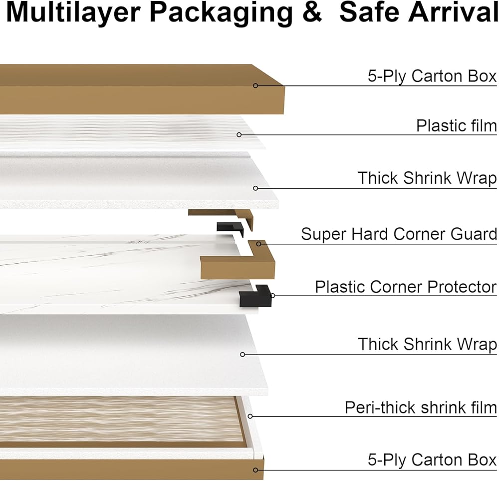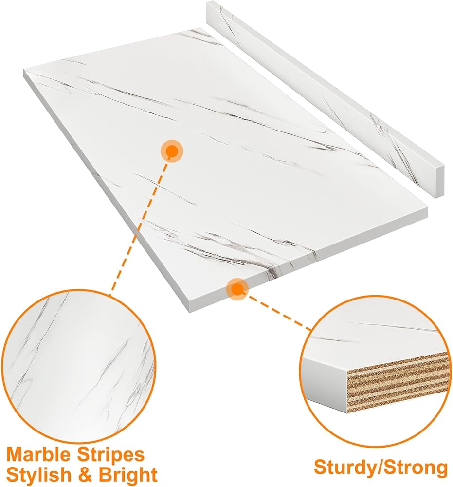 جودة عالية - مصنوعة من طبقة زخرفية عالية الضغط ولوحة CARB من درجة P2، الطبقة المتينة مقاومة للبقع والكشط والبقع، ولكنها ليست مقاومة للخدش. مادتنا عبارة عن خشب رقائقي عالي الجودة، لذلك يمكنك بسهولة بناء هيكل قوي للاستخدام طويل الأمد. يرجى ملاحظة: لا يُنصح باستخدام أسطح الرخام في البيئات ذات درجات الحرارة المرتفعة