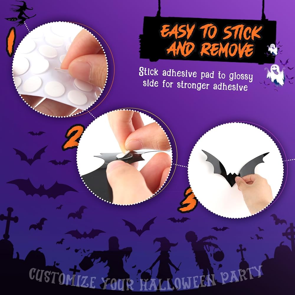• سهلة التركيب والإزالة - تم تصميم ملصقات الخفاش الخاصة بنا من أجل استخدام خالٍ من المتاعب. ببساطة قم بتقشيرها ولصقها على أي سطح نظيف وناعم. كما أنها سهلة الإزالة عن طريق تسخينها باستخدام مجفف الشعر دون ترك أي بقايا أو تلف، مما يسمح لك بإعادة تزيينها أو تغيير وضعها حسب الحاجة. بعد احتفالات الهالوين، تصبح عملية التنظيف سريعة وبسيطة. لا فوضى ولا ضجة - فقط تزيين سهل ومريح.