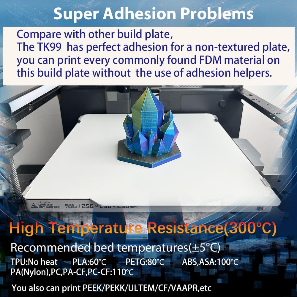 • 【Strong adhesion】TK99 build plate has the best adhesion among all the plates we encounter. After countless printing tests, even low viscosity PETG can be easily printed without the need for glue or spraying, just cleaning before printing. After the plate cools down, it can be easily demolded.