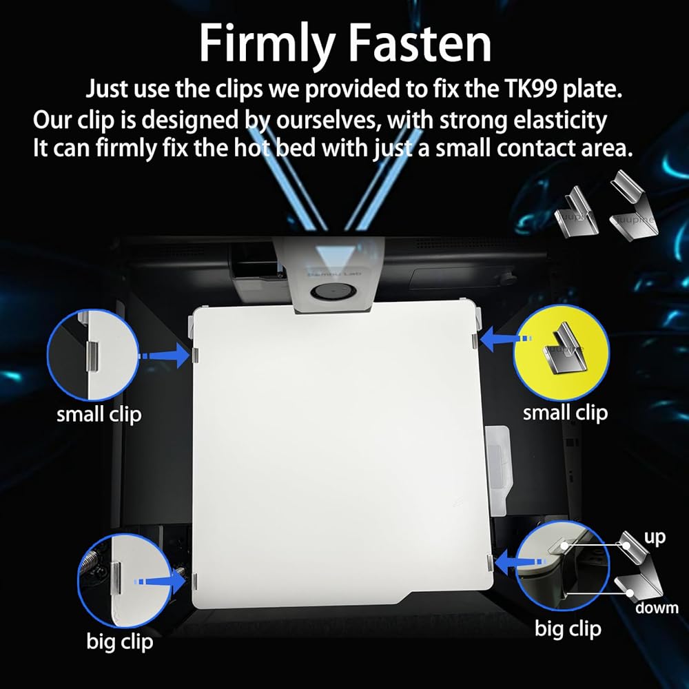 • 【NOTE】The TK99 print bed suitable for 3D printers with 257x257mm platform size, such as suitable for Bambu Lab X1C/X1/X1E/P1P/P1S, Please confirm your 3D printer platform size before ordering.The TK99 build plate does not have magnetism and needs to be used with 4 clips. If you mind not having magnetism, please do not purchase it. Please refer to the video for specific usage instructions.