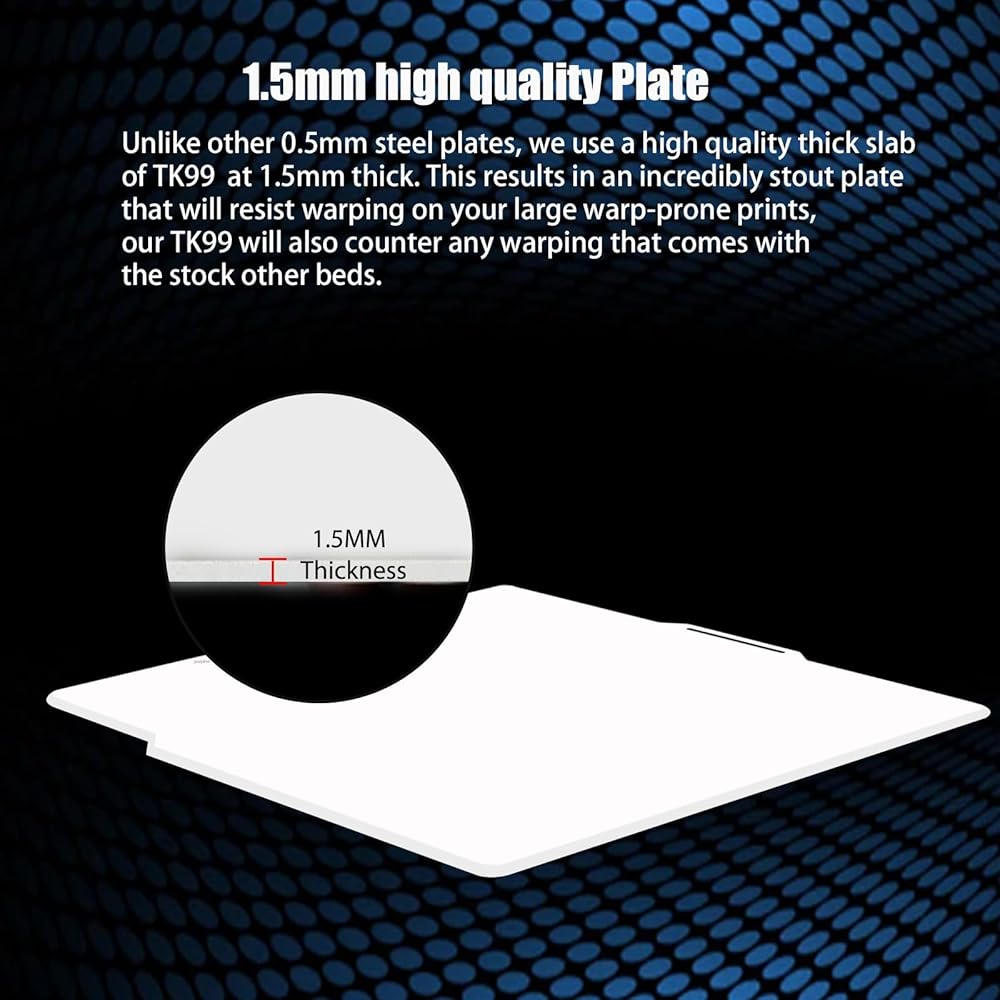 • 【Lightweight, 1.5mm thick】Most steel plates on the market have a thickness of 0.5-0.8mm, while TK99 has a thickness of 1.5mm, which means you can print large objects without worrying about the printing area being concave due to weight; Meanwhile, although TK99 is relatively thick, it is lightweight and lighter than glass of the same mass, so it will not cause a significant load on the machine.