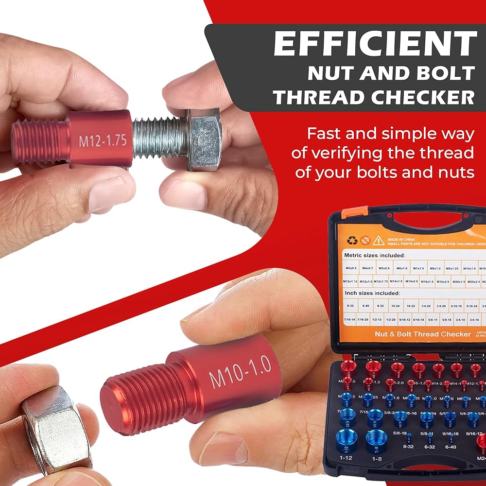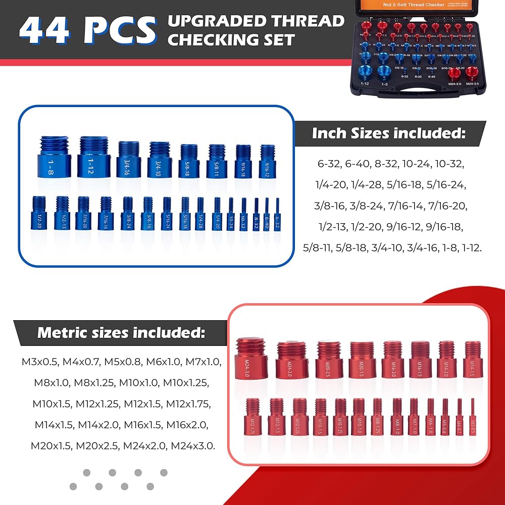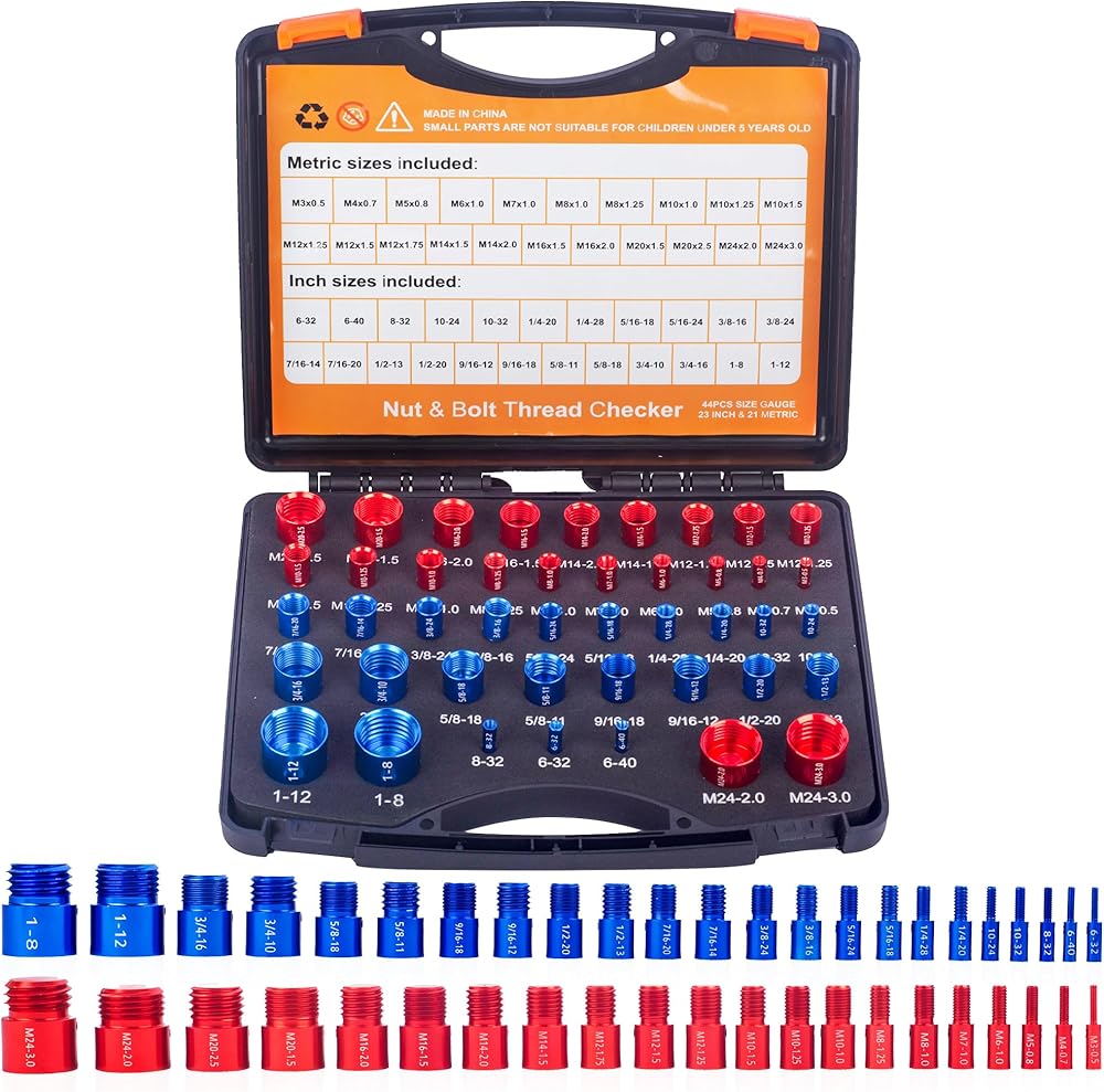 🔩 مجموعة أدوات قياس الصواميل والمسامير: تشتمل مجموعة فاحص الصواميل والمسامير لدينا على مجموعة متنوعة من 44 مقياسًا لحجم الصواميل والمسامير للذكور/الإناث لقياس درجة الخيط. استخدم مقاييس الصمولة والمسمار القابلة للفصل لفحص حجم الصمولة والمسمار وتحديده والتحقق منه.