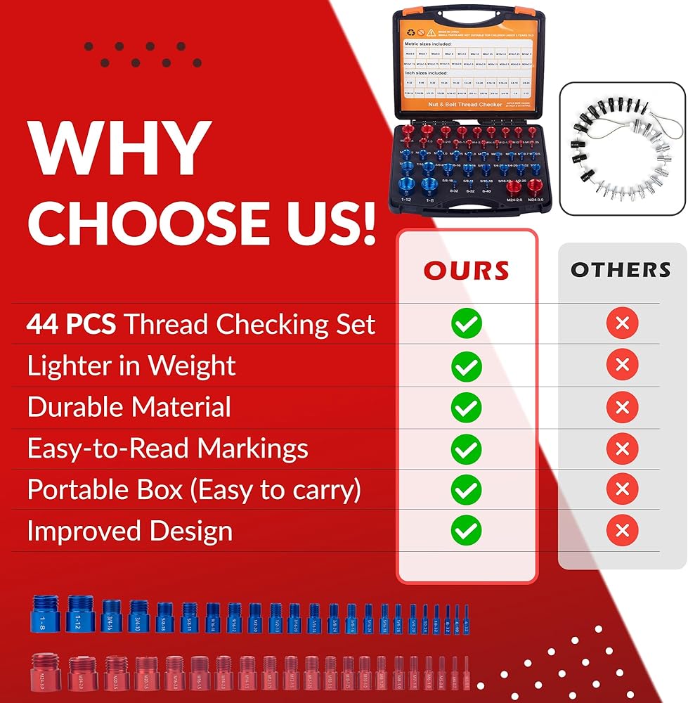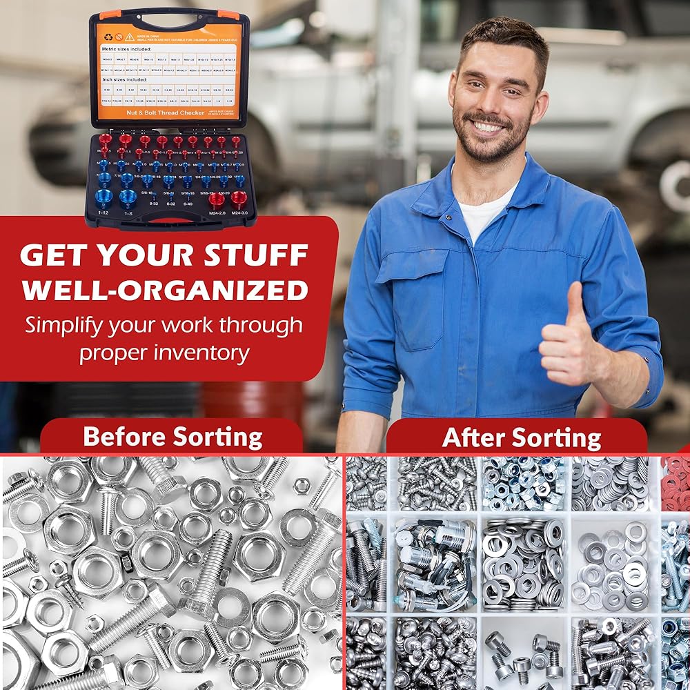 🔩 مقاس قياسي SAE/بوصة ومتري: تتضمن مجموعة مقاسات خيط الصواميل والمسمار كلاً من أدوات فحص الخيوط المترية وSAE. مجموعة أدوات قياس الصواميل والمسامير الكل في واحد للسباكين والحرفيين والمصلحين وميكانيكا السيارات والميكانيكيين في جميع أنحاء العالم.