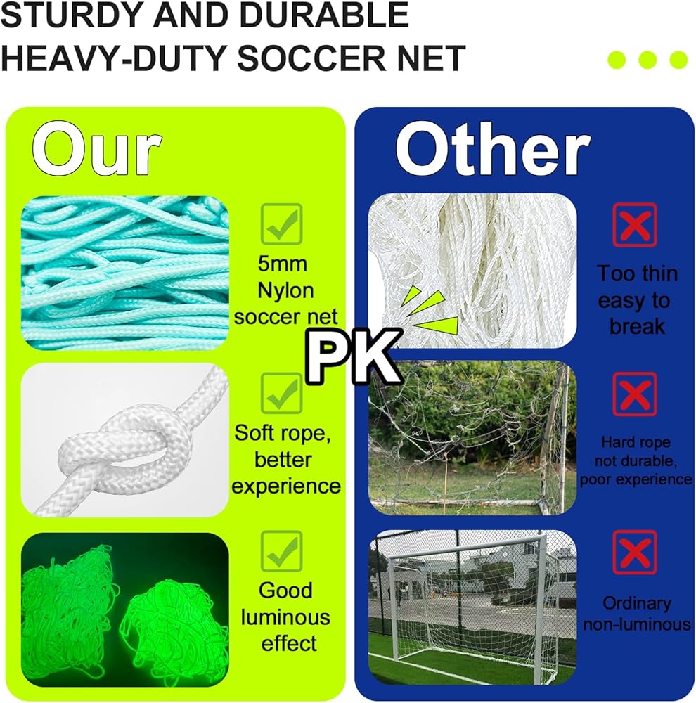 Glow in the dark soccer net: can withstand most weather, he will absorb the sunlight in the daytime, then emit a beautiful light at night, and the light effect will not be diminished by time, he will make your soccer game more interesting.
