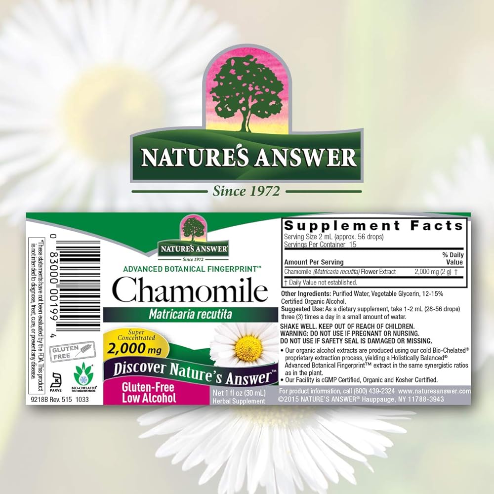 زهرة البابونج من إجابة الطبيعة مع مستخلص الكحول العضوي 2000 مجم 1 أونصة | دعم المزاج | دعم الهضم | خالي من الغلوتين، غير معدل وراثيًا، نباتي، بدون نكهات صناعية أو مواد حافظة | عدد واحد