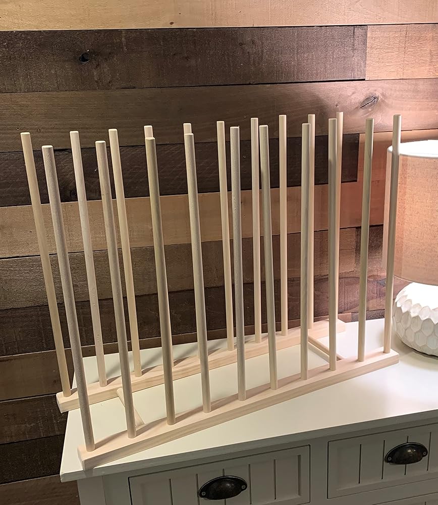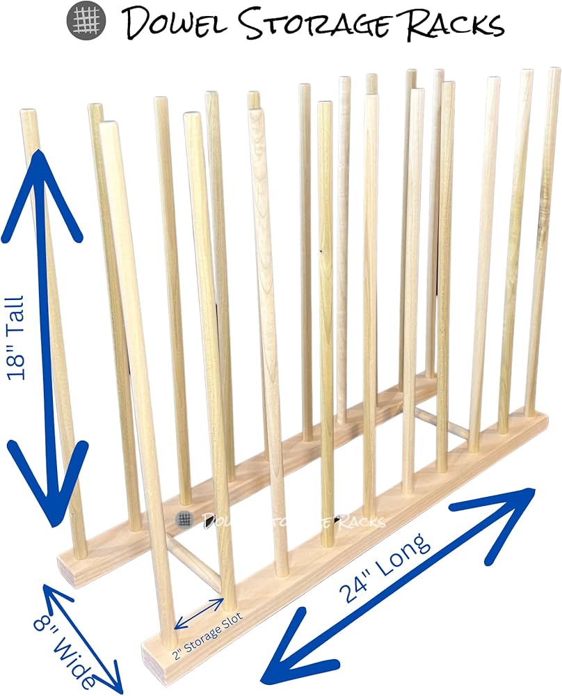 Handmade Art Storage Rack - Handmade in the USA. Rack measures 24" long by 8" wide with 18" tall dowels - Dowels are spaced 2" apart creating 9 storage spaces. This rack is intended to safely store art canvas up to 18" tall. Can also be used to store numerous other items including framed art, stained glass sheets and acrylic sheets, portfolios, sketch pads etc. Rack base is made from select Pine wood with Poplar dowels. Assembly required and instructions are included. Rack is designed to fit together without glue, screws are any other fasteners.