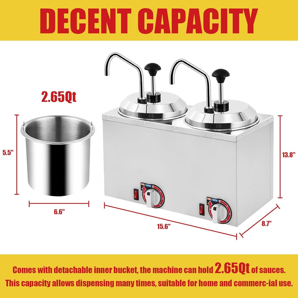 【صانعة الجبن ذات سعة كبيرة】إن جهاز تسخين موزع الجبن هو تصميم مزدوج الرأس مع دلوين داخليين قابلين للإزالة يمكنه استيعاب ما يصل إلى 2.65 لترًا من المواد بشكل فردي. تسمح هذه السعة بأجزاء متعددة دون الحاجة إلى عبوات متعددة، مما يجعلها خيارًا جيدًا للاستخدام المنزلي أو التجاري!