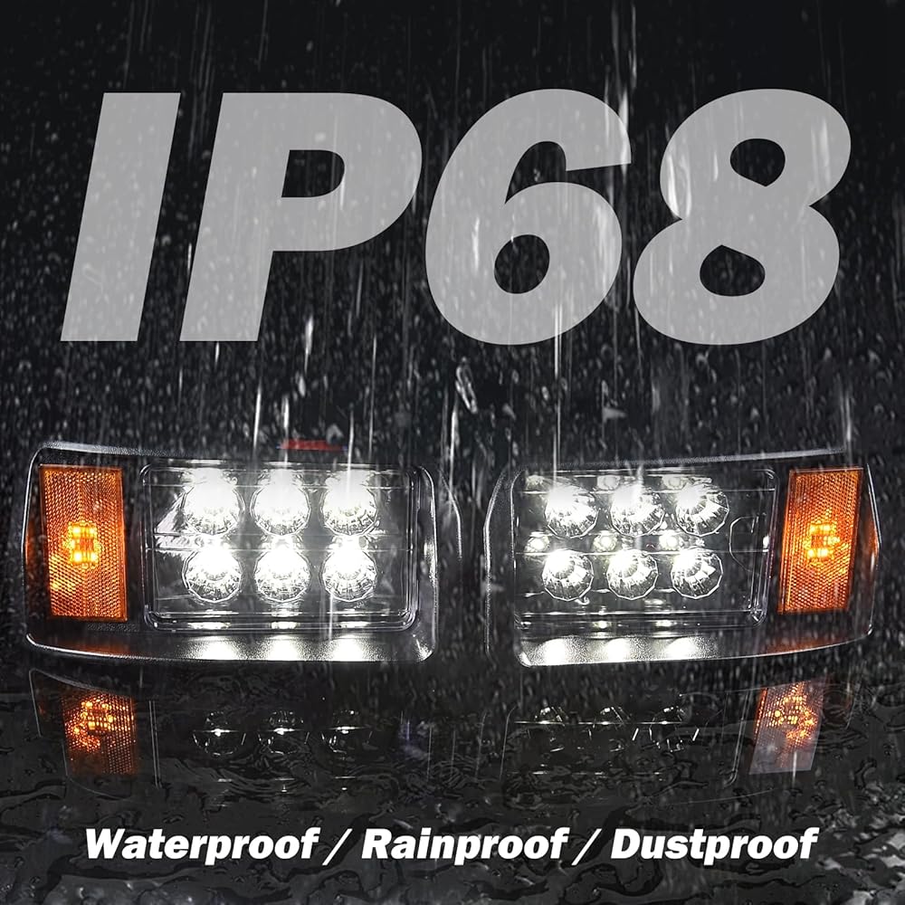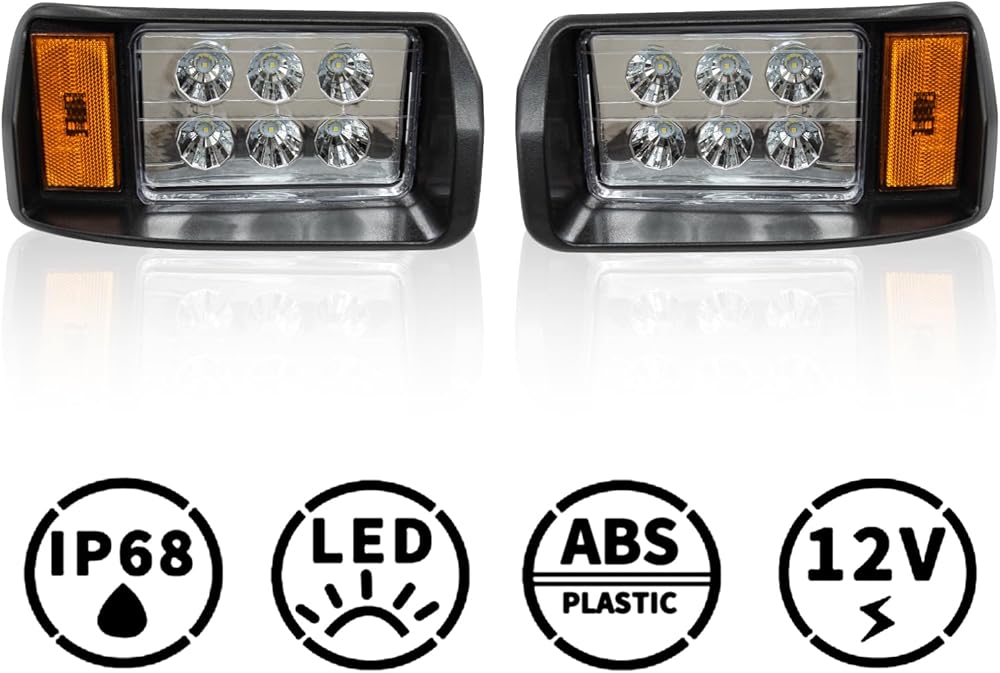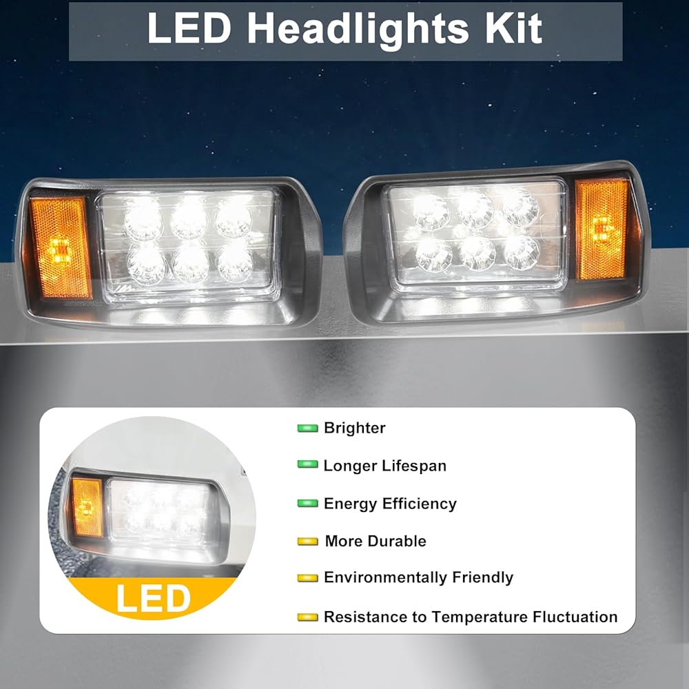 • ✅مجموعة حزمة المصابيح الأمامية DS: 1 × مصباح أمامي LED يسار. 1 × مصباح أمامي LED يمين. 1 مجموعة من قوالب القطع. (ملاحظة: بدون حزام عربة الجولف نفسها)