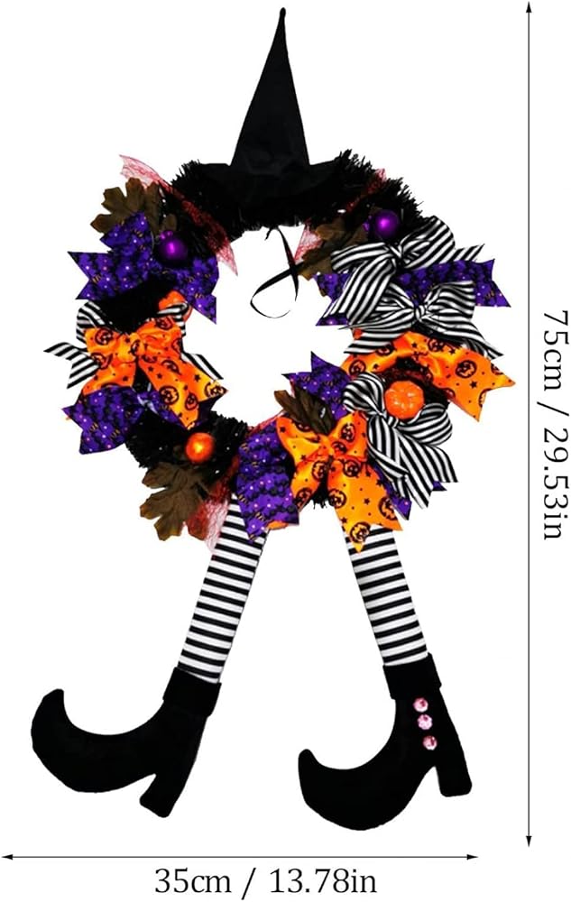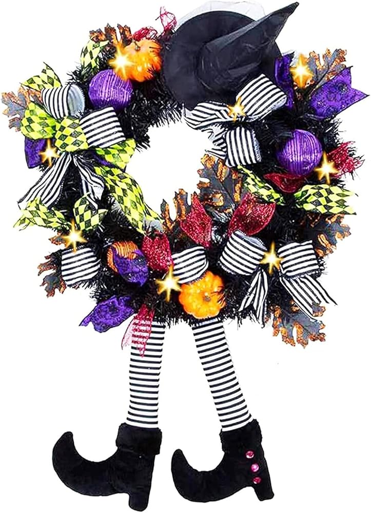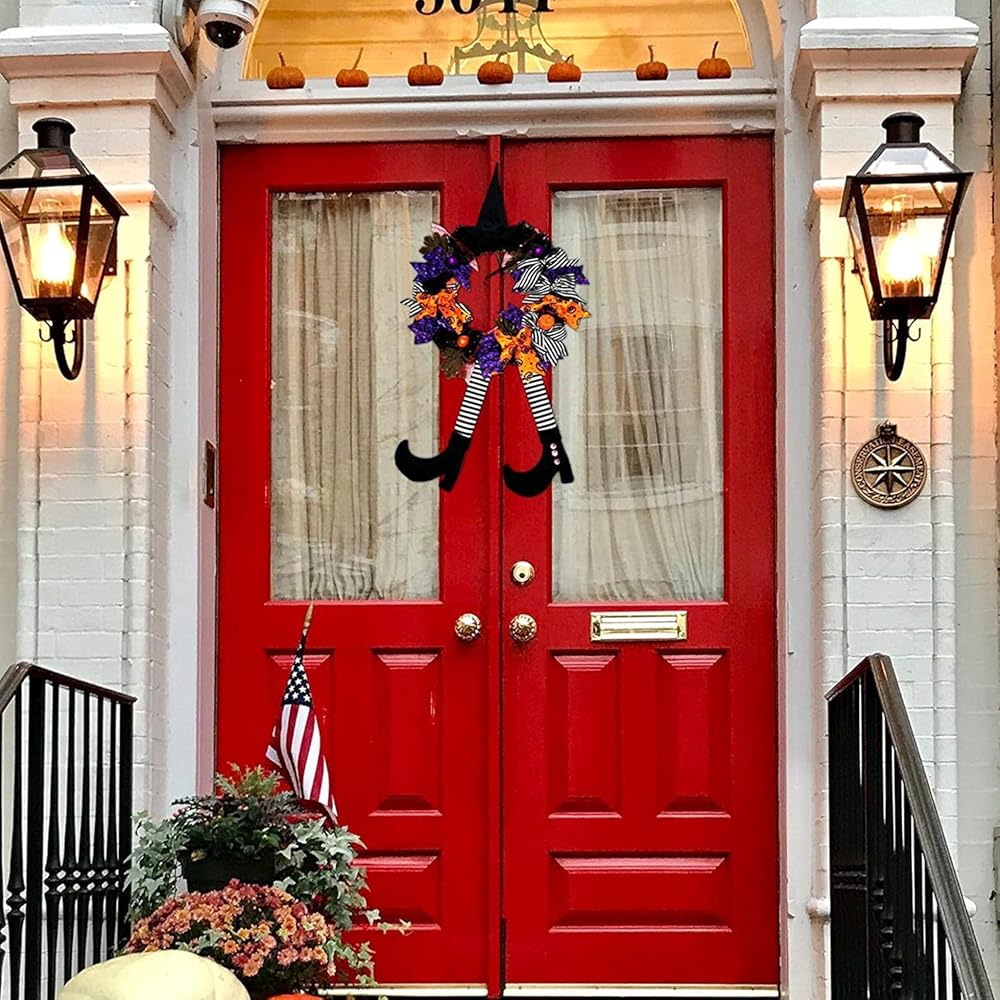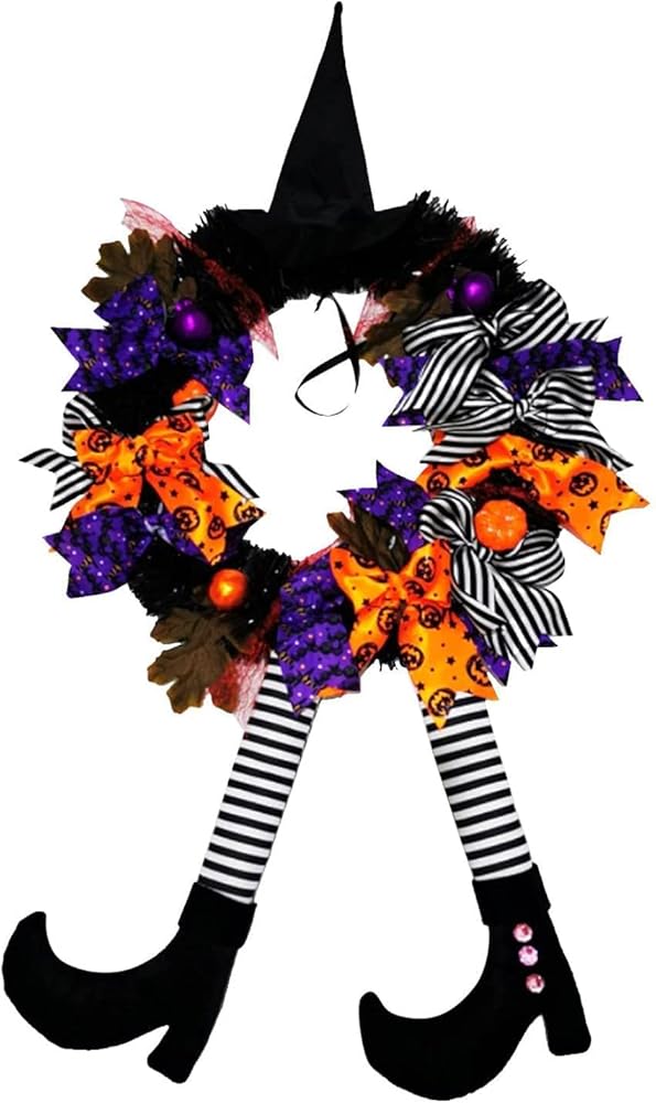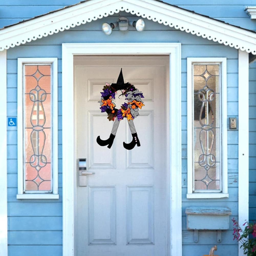 YUET إكليل الهالوين لافتة الباب الأمامي للساحرة، 16 بوصة/40 سم إكليل باب الساحرة زينة الهالوين مع قبعة الساحرة أرجل معلقة لتزيين الحفلات في الأماكن المغلقة والخارجية