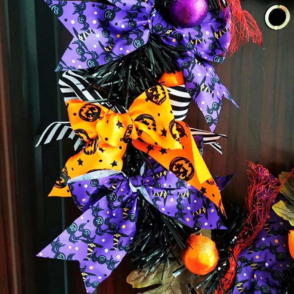 • 🎃تفاصيل المنتج: إكليل الهالوين (أسود وبرتقالي) على الباب الأمامي مزين بقبعات الساحرة وأضواء الهالوين والقرع. استخدم مجموعة متنوعة من المواد، بما في ذلك ربطات العنق الاصطناعية المتينة والأوراق والكرات الرغوية.