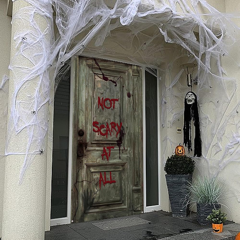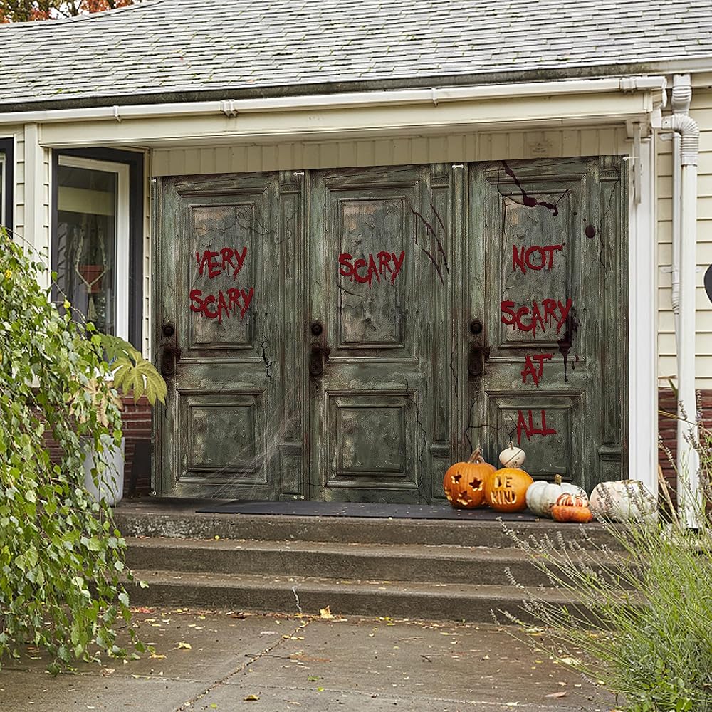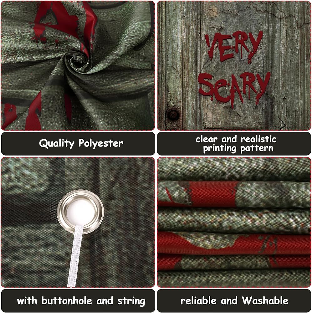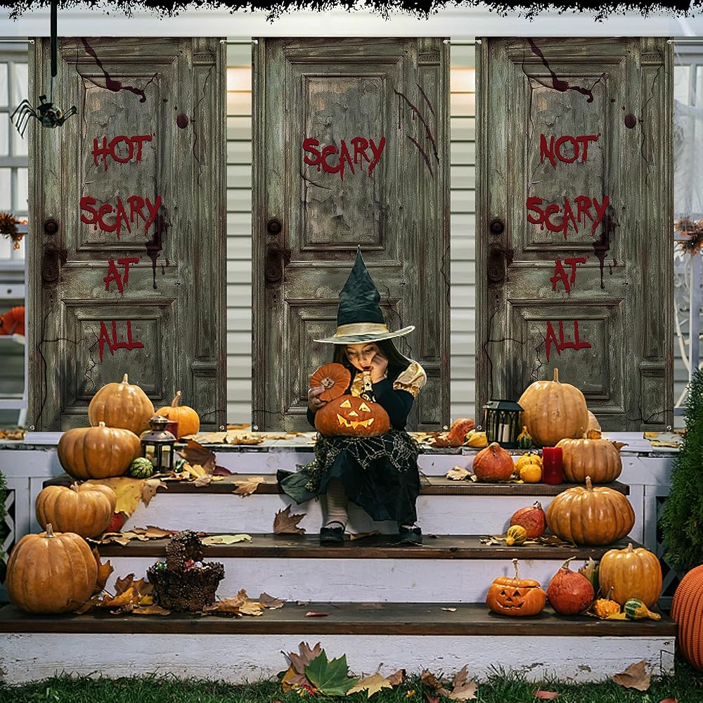 (1)Our Halloween backdrop is designed with realistic 3-panel door scene, creating a sense of terror through crumbling wooden doors and blood lettering to add festive atmosphere to your Halloween scare party.
