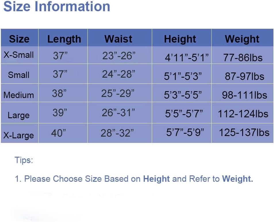 ★Important! Please Choose Size Base on Height and Weight. Waist is for Reference. and US XS=Tag/Asia Size S, US S= Tag/Asia Size M, US M= Tag/Asia Size L, US L=Tag/Asia Size XL, US XL=Tag/Asia Size 2XL, Which Means If You Got Size M, and Tag Size is L; XS(Height: 4‘11“-5'1”, Weight: 77-86 lbs ); S(Height: 5‘1“-5'3”, Weight: 87-97 lbs); M(Height: 5‘3“-5'5”, Weight: 98-111 lbs); L(Height: 5'5"-5'7", Weight: 112-124 lbs); XL(Height: 5'7"-5'9", Weight: 125-137 lbs)