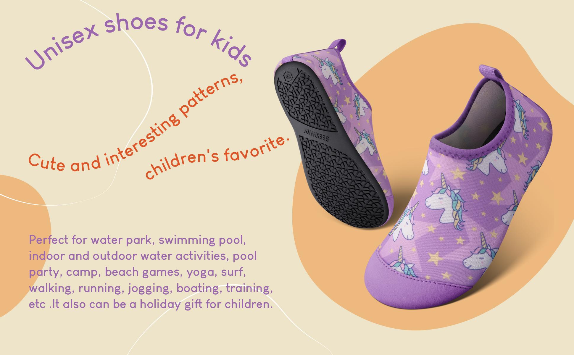 • أحذية للجنسين للأطفال: أنماط لطيفة ومثيرة للاهتمام، مفضلة للأطفال. مثالية للحديقة المائية، وحمام السباحة، والأنشطة المائية الداخلية والخارجية، وحفلات حمام السباحة، والتخييم، وألعاب الشاطئ، واليوجا، وركوب الأمواج، والمشي، والجري، والركض، وركوب القوارب، والتدريب، إلخ. .كما يمكن أن تكون هدية العيد للأطفال.