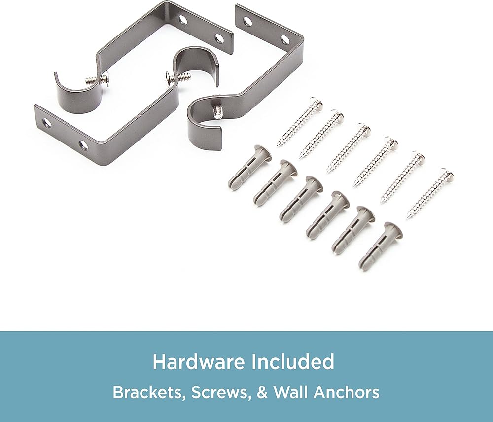 Drapery Hardware Set Includes: one telescoping steel curtain rod with decorative finials (2.24" L x 2.03" W x 2.03" H), two mounting brackets, one center support, screws, drywall anchors, and installation instructions.