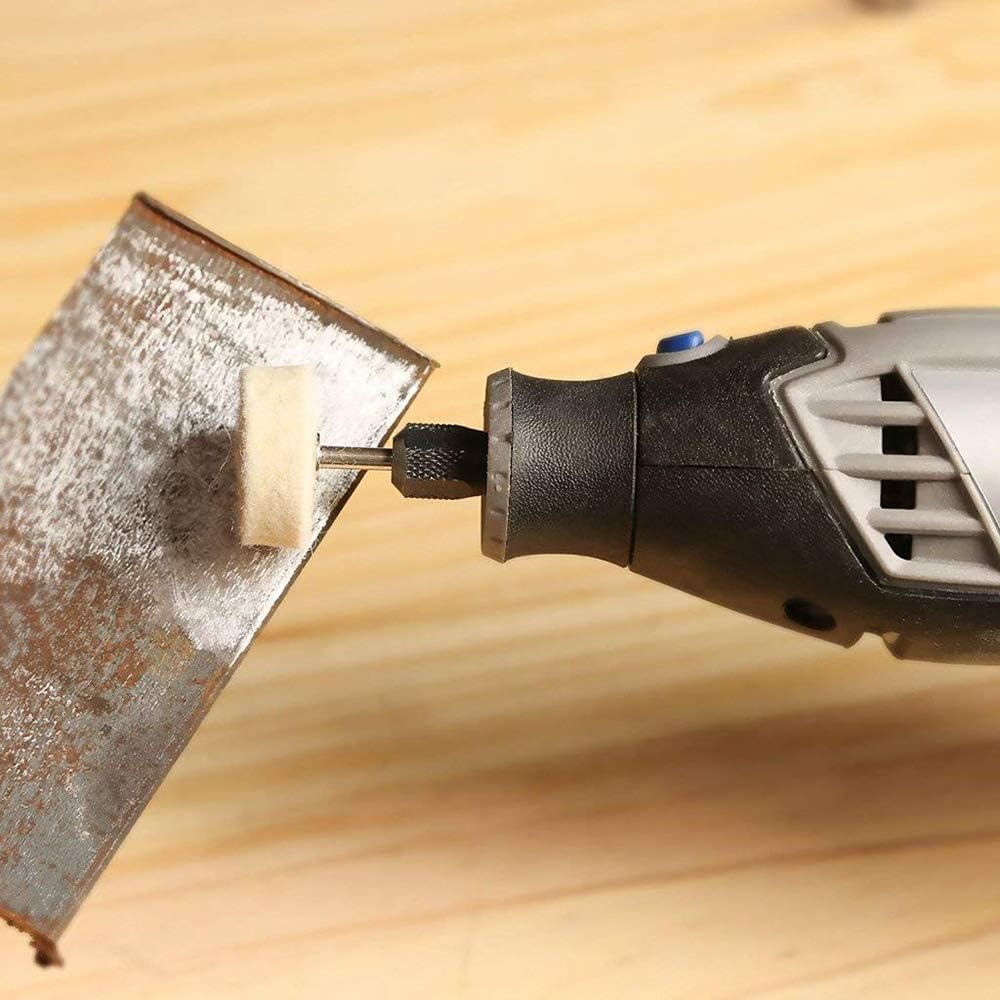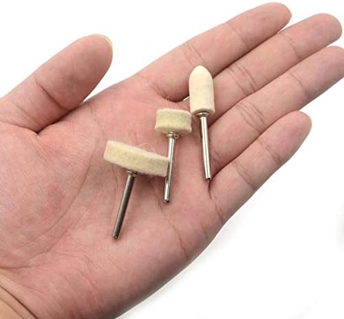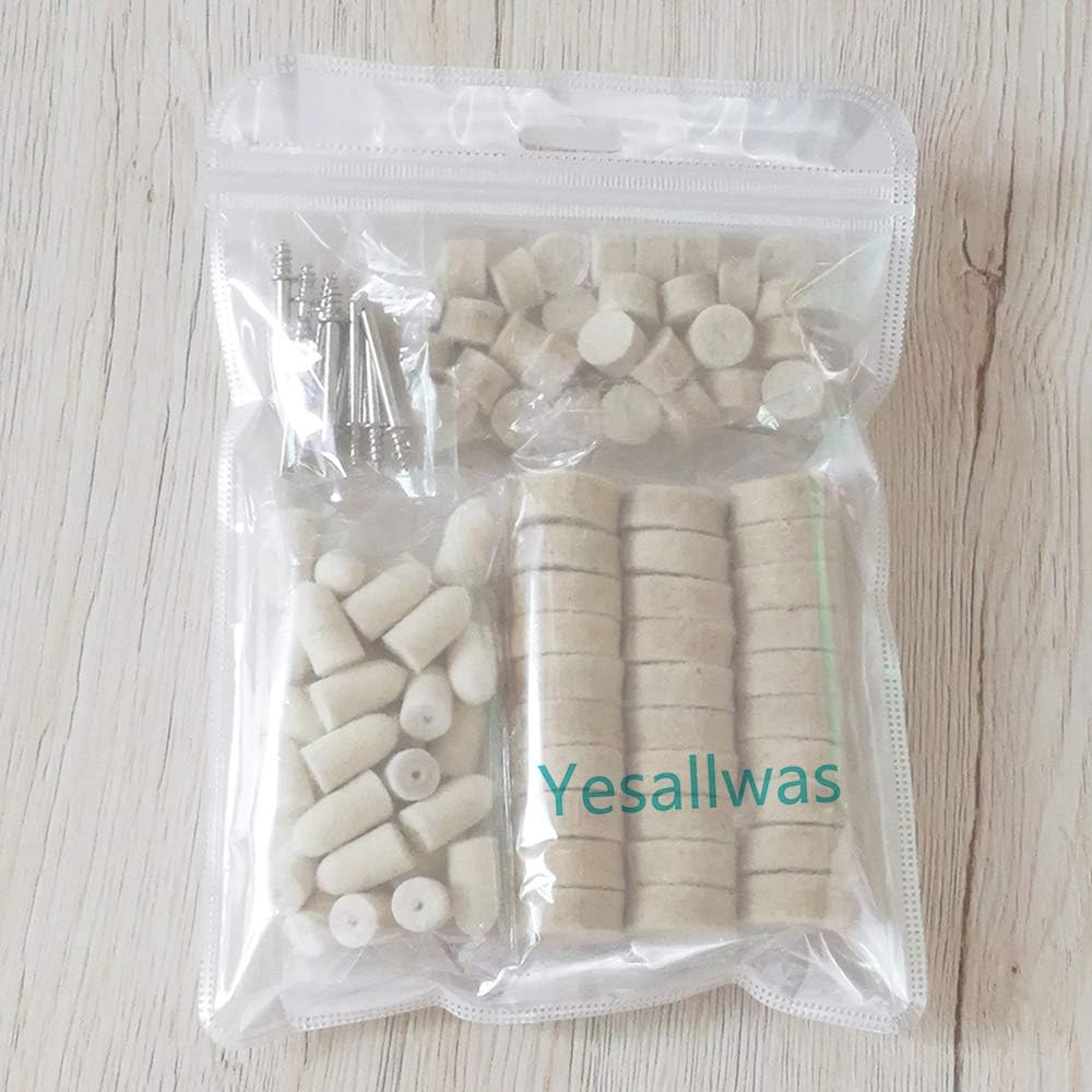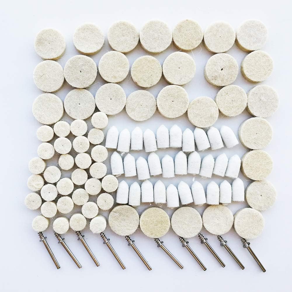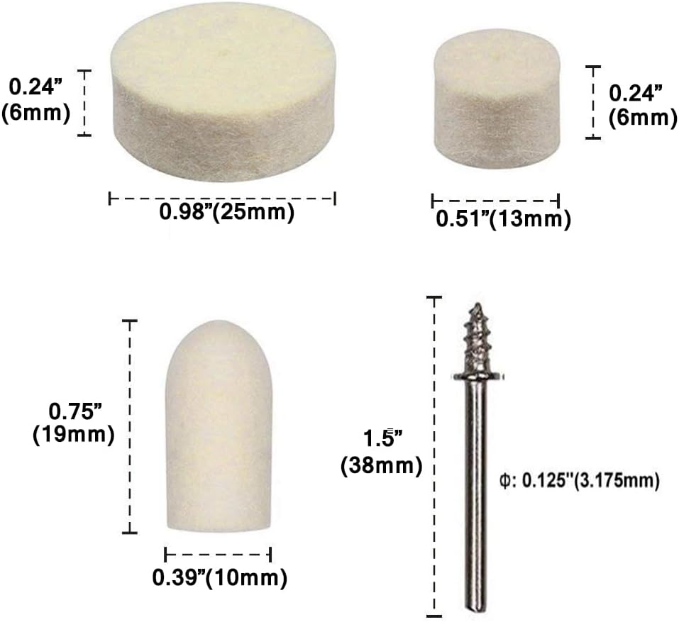 Includes: 30 PCS 1/2'' felt pad wheel; 30 PCS 1'' felt pad wheel; 30 PCS 3/8'' felt polishing tip and 10 PCS 1/8" Mandrel.Total 100 pcs.