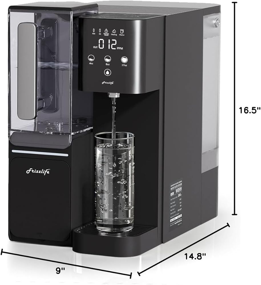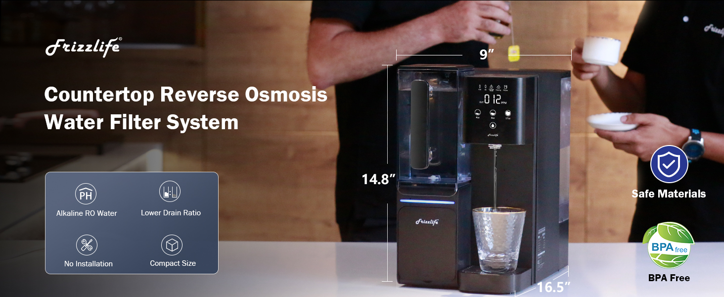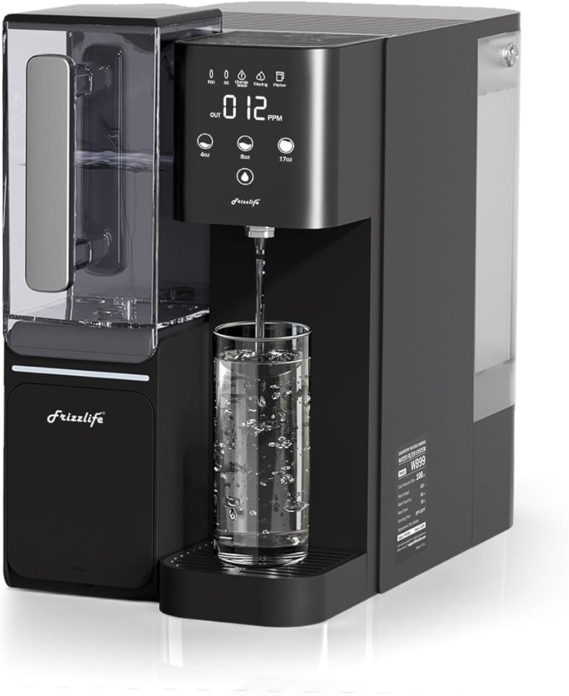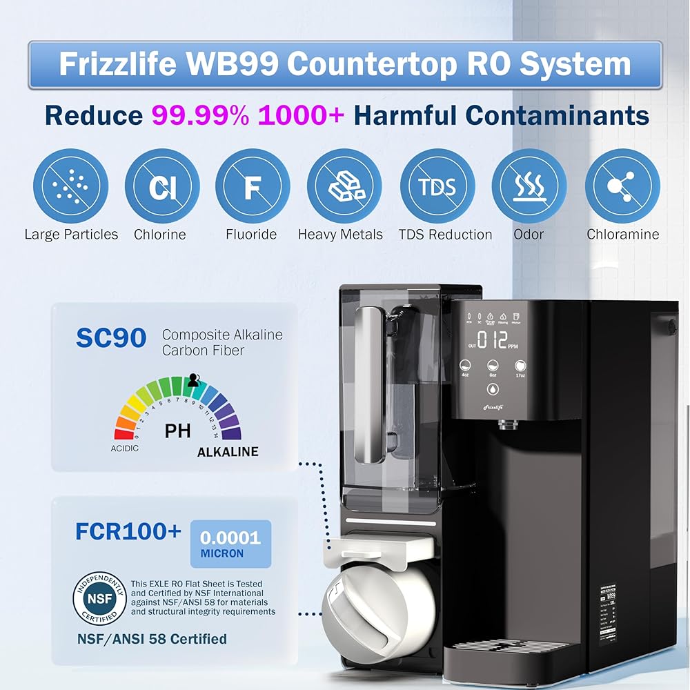 نظام التناضح العكسي لسطح الطاولة من Frizzlife - فلتر مياه قلوي RO WB99 مع إبريق ماء محمول، عناصر معتمدة NSF/ANSI 58، 3.5:1 نقي للتصريف، بدون تركيب، دعم فني بالولايات المتحدة الأمريكية