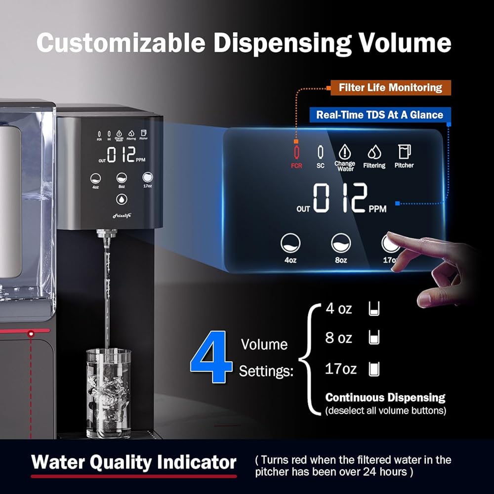 【4 أوضاع لتوزيع الحجم وخزان مياه كبير】يتميز نظام RO على سطح الطاولة من Frizzlife بأحجام توزيع متعددة: 4 أونصة، 8 أونصة، 17 أونصة وتوزيع مستمر. ما عليك سوى النقر على الشاشة لتحديد مستوى الصوت المطلوب. يرجى ملاحظة أن حجم التوزيع يخضع لانحراف ± 10%. يمكن لخزان التعبئة الكبير (152 أونصة/4.5 لتر) أن يلبي بشكل مثالي الطلب على المياه للعائلة أو المكتب. الخزان قابل للإزالة أيضًا، مما يجعل من السهل إعادة تعبئة المياه وتنظيفها.